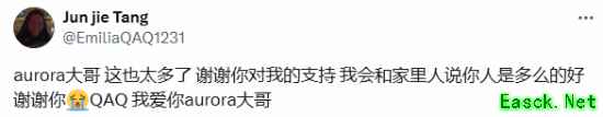 EmiliaQAQ在6月13日发文对L3rich表达了感谢:“aurora大哥,这也太多了,谢谢你对我的支持,我会和家里人说你人是多么的好。谢谢你,QAQ我爱你aurora大哥。”