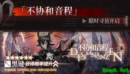 不协和音程限时寻访卡池开启,时间:6.9-6.23 设计UP干员:六星术士黑键、五星医疗濯尘芙蓉、五星狙击蓝毒。