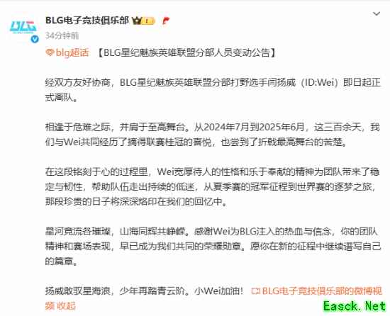 官方原文: 经双方友好协商,BLG星纪魅族英雄联盟分部打野选手闫扬威(ID:Wei)即日起正式离队。 相逢于危难之际,并肩于至高舞台。从2024年7月到2025年6月,这三百余天,我们与Wei共同经历了摘得联赛桂冠的喜悦,也尝到了折戟最高舞台的苦楚。 在这段铭刻于心的过程里,Wei宽厚待人的性格和乐于奉献的精神为团队带来了稳定与韧性,帮助队伍走出持续的低迷,从夏季赛的冠军征程到世界赛的逐梦之旅,那段珍贵的日子将深深烙印在我们的回忆中。 星河竞流各璀璨,山海同辉共峥嵘。感谢Wei为BLG注入的热血与信念,你的团队精神和赛场表现,早已成为我们共同的荣耀勋章。愿你在新的征程中继续谱写自己的篇章。 扬威敢驭星海浪,少年再踏青云阶。小Wei加油!