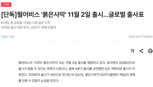 近日据韩媒MTN独家报道,Pearl Abyss旗下大作《红色沙漠》将于11月2日发售。目前《红色沙漠》开发已处于收尾阶段,如果没有变化,11月2日将是正式发售日。 ![]() 《红色沙漠》于2019年公布,最早是MMORPG游戏,之后改为动作冒险游戏,登陆PC和主机平台。多人联机和DLC正在考虑中。由于前作《黑色沙漠》积累的口碑,玩家对续作《红色沙漠》的期待值极高。 ![]() 此前有消息称,索尼曾试图争取《红色沙漠》独占发行权,但被Pearl Abyss拒绝。而《红色沙漠》原计划与《GTA6》同期推出,但随着《GTA6》延期至2026年,业内认为《红色沙漠》在今年内发售会非常轻松。 ![]() 韩国同期备受期待的新作还包括HYPE IM的《缔造者:流放之地》、NCsoft的《永恒之塔2》、Netmarble的《七大罪:起源》等,这些作品很可能与《红色沙漠》同期上线。 ![]() |
