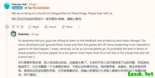 讨论《沙丘:觉醒》终局内容引不满,开发商承诺全面调整PVP平衡性。这一事件可能会对游戏社区产生积极的影响,具体分析如下: 1. 玩家满意度提升:开发商对PVP平衡性的全面调整将有助于解决玩家之间的问题,提高玩家的满意度。这不仅可以减少玩家的抱怨和不满,还可以增强游戏社区的稳定性和和谐性。 2. 游戏环境的改善:平衡性的调整将有助于创造一个更加公平和公正的游戏环境,减少恶意行为和不平衡竞争。这将有助于吸引更多的玩家参与,并提高游戏的可玩性。 3. 口碑的提升:如果开发商能够及时、有效地解决玩家的问题,并在调整后继续关注游戏社区的反馈,这将有助于提升游戏的口碑。这将有助于增加游戏的知名度和吸引力,并可能吸引更多的新玩家加入。 然而,需要注意的是,全面调整PVP平衡性可能是一个复杂的过程,需要一定的时间和努力。开发商需要仔细考虑平衡性的各个方面,并与游戏社区进行充分的沟通和交流,以确保调整后的平衡性是公平、合理和可接受的。 综上所述,开发商对PVP平衡性的全面调整将对游戏社区产生积极的影响,并有助于提升游戏的知名度和吸引力。 随着这款生存类MMO在Steam平台结束限测并正式发售,《沙丘:觉醒》的终局内容正面临玩家群体的强烈质疑——从战利品机制到平衡性问题,社区用“一团乱麻”形容当前游戏体验。 上周玩家刚就终局内容偏袒大公会的问题发起请愿,本周PVP系统又成为新的争议焦点。在Reddit热帖中,玩家指出三大核心问题: · 空中霸权失衡:地面战斗几乎不存在,敌方扑翼机可轻易碾压步兵 ·高风险低回报:即使击败敌人,粗糙地形常导致战利品丢失,且掉落多为低级装备 ·复活机制缺陷:战败方12秒内即可在附近重生,形成“人海战术”绝对优势 “当前设定下,即便你们技高一筹,人数优势方只需不断送人头,直到你们装备损坏或放弃抵抗。”另一位玩家在相关讨论中补充道。 面对质疑,Funcom创意总监乔尔·拜洛斯亲自回应:“我们正在制定一系列修改方案,请保持耐心。”虽然未透露具体更新时间,但社区对开发团队的快速响应表示认可。一位玩家回复:“你们愿意倾听反馈并积极调整的态度令人欣慰”,原帖作者也补充道:“感谢你们如此认真地对待玩家意见。” 尽管存在争议,该作仍保持着Steam“特别好评”的整体评价,在线人数也居高不下。 |