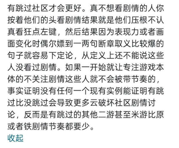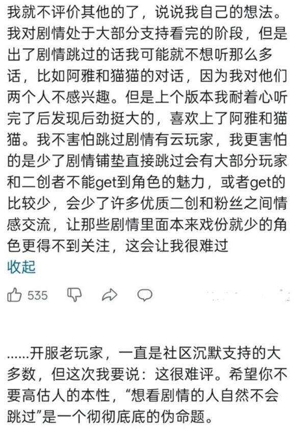 剧情跳过功能在很多游戏中都被广泛应用,旨在为玩家提供更多的自由度和灵活性,特别是在时间紧迫或者对特定剧情没有兴趣的时候。然而,在《星穹铁道》中引入剧情跳过功能却遭到大量玩家的反对,这可能会产生一些影响。 1. **影响游戏体验的完整性**: 对于许多玩家来说,游戏的剧情是他们投入时间和精力的核心部分。他们可能对《星穹铁道》的特定剧情有着深厚的情感连接,跳过功能可能会破坏这种体验的完整性和深度。 2. **限制了玩家的沉浸感**: 玩家投入时间和精力去玩游戏,是为了沉浸在游戏的世界和剧情中。跳过功能可能会削弱这种沉浸感,让玩家感觉他们只是在观看一段故事,而不是真正地参与其中。 3. **可能导致社区分裂**: 对于一些玩家来说,跳过功能可能会被视为对他们的不尊重,因为他们投入时间和精力去体验游戏剧情,但却被剥夺了这个权利。而对于另一些玩家来说,跳过功能可能会让他们有更多的自由度,可以根据自己的兴趣和时间来决定是否体验特定的剧情。 4. **可能影响游戏评价**: 如果跳过功能引发了大量的争议和反对声音,可能会影响到《星穹铁道》的游戏评价。这可能会影响到游戏的销售和社区的稳定。 综上所述,对《星穹铁道》中引入剧情跳过功能遭到大量玩家反对的影响需要考虑到上述几个因素。开发者需要认真考虑这个功能是否真的符合所有玩家的需求和期望,以及它是否真的能够增强玩家的游戏体验。在做出任何改变之前,可能需要与玩家社区进行更多的沟通和讨论。 6 月 16 日,《崩坏:星穹铁道》3.4 版本公告因一项功能更新掀起舆论波澜 —— 官方宣布将上线对话跳过、剧情梗概及后续的剧情回顾功能,评论区瞬间涌入超 2 万条留言,打破该作过往数千条的互动纪录。这场围绕剧情选择权的讨论,意外暴露了手游玩家群体在效率至上与沉浸体验之间的深层价值分歧。 在多数手游已将 “剧情跳过” 视为标配的行业环境下,崩铁玩家的激烈反应看似反常,实则源于该作独特的用户生态。作为以 “剧情驱动” 为核心卖点的游戏,其文本量庞大的星际冒险故事、精心塑造的角色弧光,早已成为玩家情感联结的重要载体。支持方认为,跳过功能赋予玩家自主选择权:“上班族午休时间有限,跳过重复对话能快速进入战斗”“二刷时不想看已读剧情,梗概功能正好提炼重点”。这类声音背后,是移动互联网时代碎片化时间利用的普遍需求,玩家希望掌握节奏控制权,避免被线性叙事束缚。 反对者的核心焦虑在于 “剧情消费模式的质变”。有玩家指出:“跳过功能会催生‘云玩家’,他们仅凭角色强度抽卡,却对剧情背景一无所知,社区讨论将失去深度。” 这种担忧并非空穴来风 —— 当剧情不再是必修内容,角色人设可能被简化为技能图标,依赖剧情衍生的二创、考据、角色解析等 UGC 内容或将萎缩,进而影响游戏 IP 的长期生命力。更有玩家从商业逻辑出发:“跳过剧情意味着制作组减少剧情投入,未来可能加速卡池更新来维持收入,形成‘重强度轻叙事’的恶性循环。” 这场争论本质上是 “游戏叙事权” 的归属问题。在传统单机游戏中,剧情是创作者构建的完整艺术作品,玩家通过线性体验感受作者意图;而在长线运营的手游中,用户既是消费者也是参与者,需要在商业盈利与玩家体验间寻找平衡。崩铁玩家对剧情的执着,折射出他们对 “沉浸式叙事手游” 的期待 —— 当游戏不再是简单的数值养成工具,而是承载世界观与角色情感的虚拟空间,剧情便成为构建身份认同的重要元素。正如有玩家留言:“每次看卡芙卡的对话,都像在追一部专属自己的星际剧集,跳过功能会让这种独特体验大打折扣。” 面对两极化的反馈,制作组的 “分步实施” 策略值得关注:3.4 版本先上线跳过与梗概,3.6 版本补充剧情回顾,既满足效率需求,又为剧情爱好者保留回溯入口。有玩家建议增加 “全剧情通关成就”“未跳过剧情专属奖励”,通过机制设计引导而非强制玩家体验内容。这种思路暗合了当下游戏设计的 “分层服务” 趋势 —— 为硬核剧情党提供深度沉浸体验,为休闲玩家简化流程,最终实现 “各取所需” 的生态共存。 当《星穹铁道》的列车继续驶向银河深处,这场关于剧情功能的讨论,终将成为游戏行业观察玩家心理变迁的样本。它揭示了一个关键事实:在流量为王的时代,仍有一群玩家执着于游戏作为 “故事载体” 的价值,他们警惕着效率工具对叙事艺术的消解,努力守护着虚拟世界里的情感温度。而如何在商业效率与玩家体验、标准化功能与个性化需求之间找到平衡点,或许正是未来长线运营游戏需要持续破解的命题。 |
