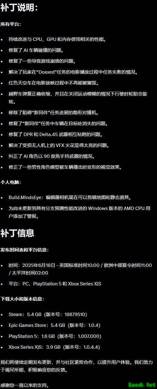 AI对话Error:提供的请求 URI 无效。请求 URI 必须为绝对 URI 或必须设置 BaseAddress。 由前《GTA》制作人指导的科幻新作《心之眼》官方发布了他们的第二个热修复补丁,现已在PC、PS5和XSX|S平台上线。该补丁更新侧重于提升性能、稳定性,修复了任务中的错误,并解决了社区玩家中的关键反馈。 根据补丁说明,所有平台的性能均已进一步提升,同时修复了多个崩溃问题以及与AI载具碰撞的Bug。进度阻碍问题也已得到解决,包括“Doxxed”任务过场动画中出现的错误结局以及“A New Companion”任务中出现的隐形障碍。此外,视觉效果问题也已修复,包括AI角色持枪动画的错误。 官方表示目前的首要任务仍然是倾听社区的意见,解决反馈中提出的关键问题,并及时部署后续补丁,团队也正在紧急发现并解决游戏中存在的问题。 《心之眼》于6月11日发售,但由于首发表现不佳(包括优化差,Bug多,画质很糊等问题)遭到批评,制作组随即发布致歉,并于6月13日公布了首个热补丁,提升优化了游戏的性能。 本文由制作发布,未经允许禁止转载。 更多相关资讯请关注:心之眼专区 |