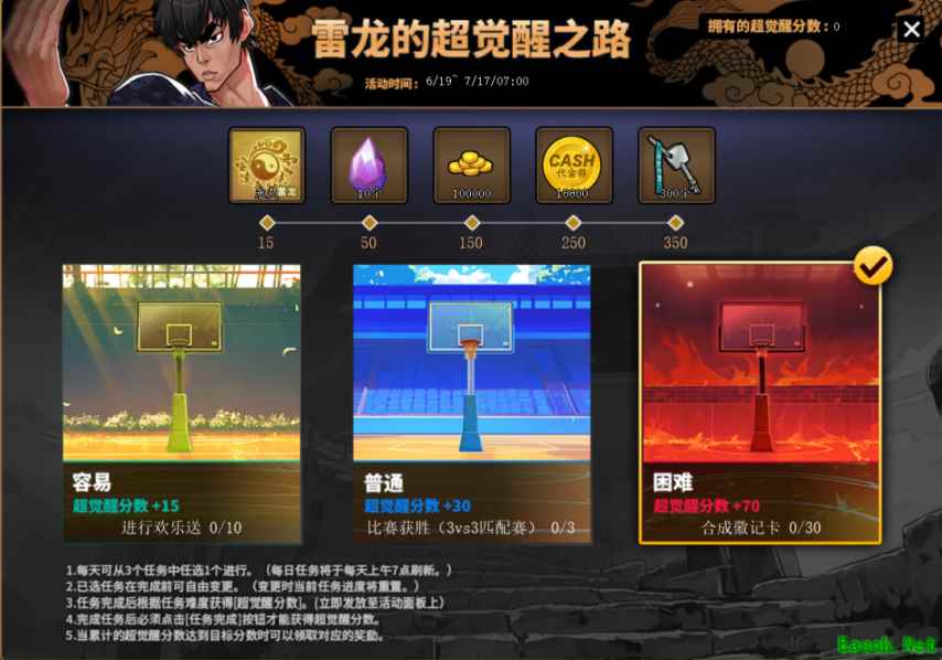 AI对话Error:提供的请求 URI 无效。请求 URI 必须为绝对 URI 或必须设置 BaseAddress。 再度飞翔吧!超觉醒雷龙!《街头篮球》全新版本将于6月19日正式上线~让我们一起欣赏下精彩的VCR吧~ 【再度飞翔吧!超觉醒雷龙】 活动时间:6月19日服务器维护后~7月17日7点活动规则:玩家每天可以从3个任务中任选1个进行,已选任务在完成前可以自由变更。通过选择并完成任务获得觉醒分数,累计达到目标分数后可以领取对应的奖励。奖励包含:超觉醒雷龙的碎片*10、普通雷龙角色包、代金券*10000、300个角色强化碎片箱钥匙等。 【雷龙超觉醒卡限时售卖】 活动时间:6月19日服务器维护后~7月17日7点 活动界面或商城可购买“限定超特抽取券(超觉醒雷龙)”,使用可以抽取商品。道具抽取有概率获得超觉醒雷龙的碎片、徽记卡转送券等珍稀道具。抽取道具时会获得“限定超特兑换券(超觉醒雷龙)”,也可用于兑换道具以及超觉醒雷龙的碎片。超觉醒雷龙的碎片可用于兑换超觉醒雷龙觉醒卡、超觉醒雷龙相关动作等。若使用角色变更卡,超觉醒雷龙的相关动作将清除。 创建超觉醒雷龙后个人增益会一直适用。(所有能力值+1)该个人增益只对超觉醒雷龙适用,可与其他队伍的团队增益叠加适用。 创建超觉醒雷龙时可以从31种专用能力中选择2种,选择的2种专用能力比赛中一直适用。 【推出全新的更改动作道具!】 1. 会装备到更改外形槽位里!2. 会更改进攻和防守无球移动时的动作!3. 会更改原地拍球动作和拍球移动时的动作!4. 会更改默认的胯下换球动作! 【喵喵!猜数字】 活动时间:6月19日服务器维护后~7月3日7点活动规则:四只猫咪会随机选择数字。-三彩∶从数字1、2、3中随机选择1个(1/3概率)-煤球∶从数字4、5、6中随机选择1个(1/3概率)-芝士∶从数字7、8中随机选择1个(1/2概率)-年糕∶从数字9、10中随机选择1个(1/2概率)点击[设置]按钮选择4个数字后,再点击[挑战]按钮来挑战猜数字。点击[挑战]后就不能更改设置的数字。根据正确答案数量来决定获得的商品等级。 【只限一人】 活动时间:6月19日服务器维护后~7月10日7点活动规则:活动期间内根据消耗的点券金额来进行排行。(不包含代金券)活动结束后结算排行时给第1~20名玩家发放奖励。奖励根据最终排名来发放,给第1名玩家发放专属特别奖励。 |