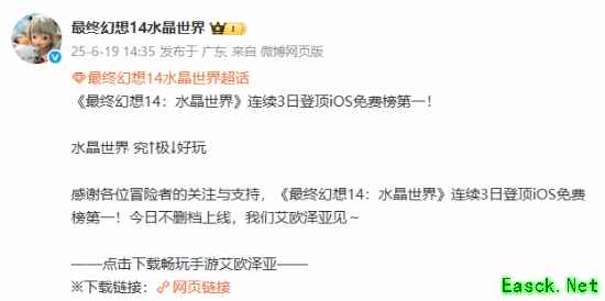《最终幻想14:水晶世界》连续3日登顶iOS免费榜!你玩了吗?