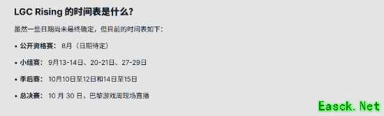 据介绍,LGC面向所有女性开放,目标是营造一个尊重、竞争的环境,让每个人都能尽情玩耍、成长,并享受来自观众们的赞美。 根据公布的赛程,本联赛预计将于8月开赛,进行公开资格赛,具体日期待定。而小组赛将于9月13日开赛,持续至29日,季后赛则会在10月10日至15日开打,最终总决赛将在巴黎游戏周的现场进行直播!