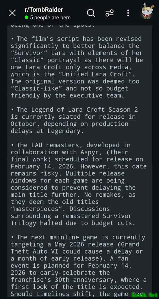 古墓丽影作为一款广受欢迎的游戏系列,其续作的发布总是会引起玩家的广泛关注。如果古墓丽影的续作真的在明年发售,这将会给玩家带来全新的游戏体验,包括新的故事情节、角色设定、游戏机制等。此外,对于那些一直喜欢这个系列的玩家来说,新作的出现也意味着他们可以继续与他们最喜欢的角色一起探索未知的世界,这无疑会给他们带来极大的乐趣。 同时,对于那些期待高清复刻的老游戏的高清复刻版,这意味着他们可以再次体验这些经典的游戏,而无需购买新的硬件。对于一些已经不再拥有最初游戏或者已经遗失的老游戏的玩家来说,这是一个非常好的消息。这些游戏的高清复刻可以让更多的人有机会体验到这些经典的游戏,也可以让这些游戏在新的平台上焕发新的生命力。 然而,对于一些已经购买了原始游戏的玩家来说,高清复刻可能会带来一些经济上的影响。他们可能需要购买新的版本以与其他玩家一起玩,或者他们可能需要为高清复刻版支付额外的费用。此外,高清复刻可能会吸引更多的玩家,从而导致游戏服务器人满为患,这对于那些已经购买了游戏的玩家来说可能会造成一些不便。 总的来说,古墓丽影续作的发布以及老游戏的高清复刻将会给玩家带来全新的游戏体验和机会,同时也可能会带来一些经济上的影响。对于一些玩家来说,这无疑是一个令人兴奋的消息,而对于另一些人来说,这也可能是一个需要适应的过程。无论如何,我们都期待看到这些新作带来的精彩内容。 在《古墓丽影》的Reddit子版块上,有用户发布了据称是新作的泄露信息,随后该帖子被删除。该用户曾警告称“帖子很快会被撤下”,但在其删除之前,已经有人截图保留了内容。 部分内容翻译如下: 下一部主线作品将不会被命名为“古墓丽影12”,官方已完全放弃数字编号系统。该项目在内部以代号“Black Diamond(黑钻)”称呼,正式标题尚未确定。 项目在2023年夏天经历了一次重大创意方向调整,同时也伴随着突如其来的裁员。 Aspyr工作室的最后一个项目“LAU三部曲”(《古墓丽影7:传奇》、《古墓丽影:10周年纪念版》和《古墓丽影8:地下世界》)的高清复刻版计划于2026年2月14日发售。不过,该日期存在较大变数,为避免影响主线新作的进度,官方正在考虑为三部作品分别安排多个发布时间窗口。不是重制版是因为官方认为老作品是“经典之作”。原定的“幸存者三部曲”高清复刻因预算削减而被搁置。 新的主线续作当前目标是于2026年5月发售(如果《GTA6》对市场造成压力,则可能提前或推迟一个月)。官方计划在2026年2月14日,也就是系列30周年纪念日当天举办粉丝活动,届时将首次公开新作内容。如果进度有所变动,可能改为在“TGA”上亮相,计划仍有变数。关于是否在今夏提前发布新作发展方向声明,官方也正在讨论中。 需要指出的是,以上这些消息并无明确可靠的官方背书。关于下一部《古墓丽影》,除了由水晶动力将使用虚幻引擎5开发、将由亚马逊游戏发行、统一所有时间线、以《幸存者》三部曲作为劳拉的起源、以及卡米拉·卢丁顿不会继续扮演劳拉·克劳馥之外,官方尚未透露任何消息。因此希望大家理性看待。 本文由制作发布,未经允许禁止转载。 |