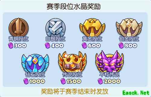 军团战争赛季结算 S2赛季更新后,游戏将现有军团段位进行重置(黄金以下段位不受重置影响),并发放上赛季奖励,登陆游戏即可领取到丰厚的水晶奖励。