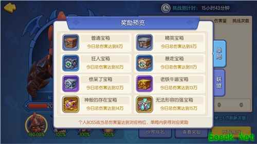 【BOSS奖励】 单局奖励:根据指挥官个人的今日总伤害量,领取各类宝箱奖励 联盟奖励:根据联盟BOSS剩余血量,以及BOSS击杀情况,领取各类宝箱奖励 宝箱中可以获取到全新的灵器系统相关道具:戒指,重铸道具,注魔道具,鉴定道具等