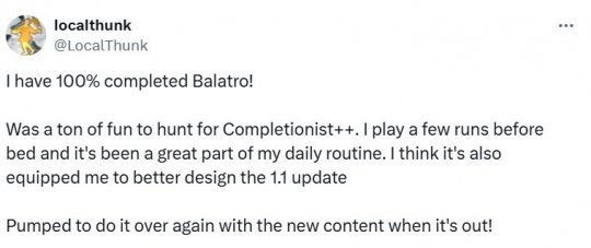 Balatro游戏开发者Localthunk宣布自己"100%完成《小丑牌》",并宣称为下个版本更新做好了更充分准备。 ![]() 在社交媒体推文中,Localthunk表示在自己开发的游戏中达成"终极全成就"是"极富乐趣的狩猎过程",他通过"每晚睡前玩几局"达成了这个里程碑。 ![]() "这已成为我日常生活的美好组成部分,"他说道,"同时也让我能更得心应手地设计1.1版本更新。等新内容上线后,我迫不及待要再来一轮全成就挑战!" 推文附带的成就截图显示:截至6月20日,他已集齐所有小丑牌的金色贴纸——目前全球达成此成就的玩家不足1%。 ![]() 在社交平台回复玩家时,Localthunk透露主要使用"幽灵牌组"达成目标,辅以"彩绘牌组"和"黄色牌组","偶尔也会随机选牌组增添趣味"。 |