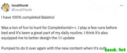 《小丑牌》1.1版本更新准备就绪,作者完成了游戏的全成就,这一消息对玩家可能产生的影响如下: 1. 提高了玩家的期待值:当作者宣布完成所有成就时,玩家会期待这款游戏会有更多的内容、更深入的玩法,或者期待新的游戏模式和规则。 2. 增强了玩家的参与感:这种全身心投入完成所有成就的决心,可能会让玩家对即将到来的1.1版本更新抱有更高的期待和参与热情。 3. 提供了新的挑战:作者完成所有成就的消息可能会激发玩家的挑战欲望,他们可能会尝试在新的1.1版本中达成新的成就,或者寻找新的策略和玩法来赢得游戏。 4. 提供了新的内容:新的版本更新通常会带来一些新的内容和规则,这可能会吸引那些喜欢尝试新事物的玩家。 5. 可能会引发一些争议:新的版本更新也可能带来一些争议,例如新规则或玩法可能并不被所有玩家接受,或者作者的新成就设定可能引起一些玩家的不满。 总的来说,作者完成游戏全成就并准备进行1.1版本更新,这对玩家来说可能会带来许多积极的影响,包括更高的期待、更高的参与度、新的挑战、新的内容和规则以及可能的争议。但具体的影响还需要看具体的更新内容和玩法设定。 Balatro游戏开发者Localthunk宣布自己"100%完成《小丑牌》",并宣称为下个版本更新做好了更充分准备。 在社交媒体推文中,Localthunk表示在自己开发的游戏中达成"终极全成就"是"极富乐趣的狩猎过程",他通过"每晚睡前玩几局"达成了这个里程碑。 "这已成为我日常生活的美好组成部分,"他说道,"同时也让我能更得心应手地设计1.1版本更新。等新内容上线后,我迫不及待要再来一轮全成就挑战!" 推文附带的成就截图显示:截至6月20日,他已集齐所有小丑牌的金色贴纸——目前全球达成此成就的玩家不足1%。 在社交平台回复玩家时,Localthunk透露主要使用"幽灵牌组"达成目标,辅以"彩绘牌组"和"黄色牌组","偶尔也会随机选牌组增添趣味"。 |