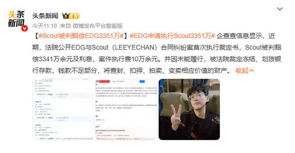 LOL圈又出一名老赖?!Scout被判赔偿EDG3351万登顶热搜,还不上就查封资产!