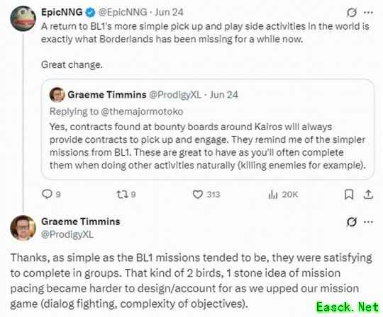 《无主之地3》是一款深受玩家喜爱的开放世界游戏,它提供了丰富的随机任务和多人游戏模式。如果《无主之地4》继续提供经典的随机任务,玩家可能会喜欢这种设计。 首先,随机任务可以提供一种持续的挑战和新鲜感。每次玩家进入一个新的区域或完成一个主线任务时,他们可能会遇到不同的随机任务,这会让他们感到兴奋和好奇。这种不确定性可能会吸引那些喜欢探索和挑战的玩家。 其次,随机任务可以增加游戏的社交性。多人游戏模式允许玩家与其他人合作或竞争,而随机任务可以为这种社交体验增添更多的趣味性。玩家可以与其他人一起完成任务,分享成功的喜悦和击败敌人的成就感。 然而,随机任务也可能会对玩家产生一些负面影响。如果任务难度过高或过低,或者奖励不公平,可能会让一些玩家感到沮丧或无聊。此外,如果任务过于简单或过于复杂,可能会影响游戏的平衡性。因此,开发团队需要仔细平衡任务的难度和奖励,以确保所有玩家都能享受游戏。 总的来说,《无主之地4》如果提供经典简单的随机任务,可能会受到玩家的欢迎。这种设计可以为游戏带来持续的挑战和新鲜感,增加游戏的社交性,但同时也需要开发团队仔细平衡任务的难度和奖励。 以上内容仅供参考,建议咨询资深游戏玩家获取更多信息。 近日《无主之地4》创意总监Graeme Timmins表示,本作将提供经典简单的随机任务。随着游戏复杂度不断提升,这些任务的制作难度也越来越大。 近日Timmins在推上与玩家互动,他确认《无主之地4》将提供类似《无主之地1》那样随机任务,玩家可在凯洛斯星球的悬赏板上承接。 Timmins表示这些简单且直接的任务非常棒,让他想起初代的经典设计,玩家在进行其他任务时就能自然达成,比如击杀敌人时可能刚好达成契约条件。这能让玩家感觉不是在刷任务。 有粉丝表示很喜欢这个系统,Timmins回复道:“”谢谢,这种任务虽然简单,但组合在一起还是很有成就感的。但随着现在游戏玩法和任务的复杂化,这种‘一石二鸟’的任务节奏也越来越难设计。 《无主之地4》将于9月12日发售,登陆PS5、XSX/S和PC。NS2版将在年内上市。 |