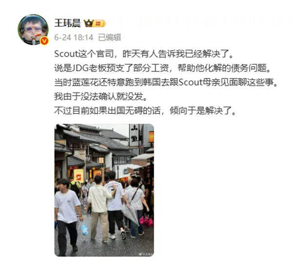 背刺EDG战队的Scout3000万债务被JDG老板解决?!当事人现身日本惬意旅游!