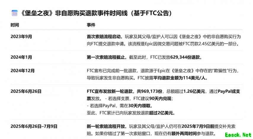 《堡垒之夜》非自愿花费被FTC退回高达1.26亿美元,索赔仅限两周,对玩家有以下影响: 1. **经济影响**:对于玩家来说,尤其是那些在游戏中投入大量资金的玩家,这可能导致他们需要退回已经投入的资金。这不仅会对他们的财务状况产生影响,也会对玩家的心理状态产生影响。 2. **游戏体验影响**:对于那些依赖于《堡垒之夜》的玩家来说,这可能导致他们对游戏失去信心,从而影响他们的游戏体验。 3. **法律影响**:这可能会对其他游戏公司产生影响,促使他们更加重视用户的隐私问题,并采取措施确保用户的个人信息不被滥用。 4. **对游戏市场竞争的影响**:这可能会影响《堡垒之夜》的市场地位,并可能导致其他游戏公司更加努力地为用户提供更好的服务和体验。 总的来说,这个事件可能会对《堡垒之夜》的玩家、游戏行业以及整个电子竞技领域产生深远的影响。 美国联邦贸易委员会 (FTC) 今日宣布,将向在《堡垒之夜》中发生非自愿购买的玩家发放退款,退款总额超过1.26亿美元。FTC还将重新开放流程,允许玩家及其父母或监护人从现在起至2025年7月9日提出进一步的索赔。 此次最新退款是继2024年12月Epic因“欺骗性”行为导致玩家进行非自愿购买而发放的62万9344份退款之后的又一举措。 FTC称Epic存在“欺骗性”行为,导致玩家最初进行非自愿购买。虽然该机构披露12月平均退款金额为每人114美元,但并未透露此次平均退款金额,或许是因为玩家仍有时间提交索赔。 不过,从今天开始,FTC将通过PayPal或支票发放96万9173份退款。如果你在索赔表中选择接收支票,FTC建议你在90天内兑现。 PayPal收款人应在30天内兑换退款。包括今天的退款在内,美国联邦贸易委员会 (FTC) 已向玩家支付了超过2亿美元的款项,这是其对Epic Games采取惩罚措施的一部分。 此次索赔流程始于2023年9月,是Epic因《堡垒之夜》微交易问题被处以2.45亿美元罚款的一部分。首次索赔流程从2023年9月持续到2024年1月,如果你错过了该期限,现在你还有额外的两周时间可以从Epic Games获得退款。 |
