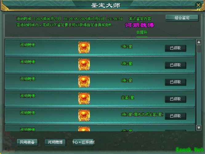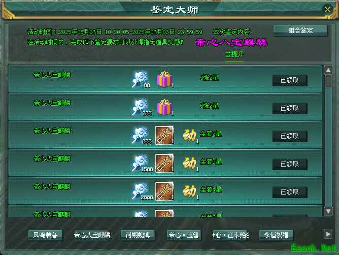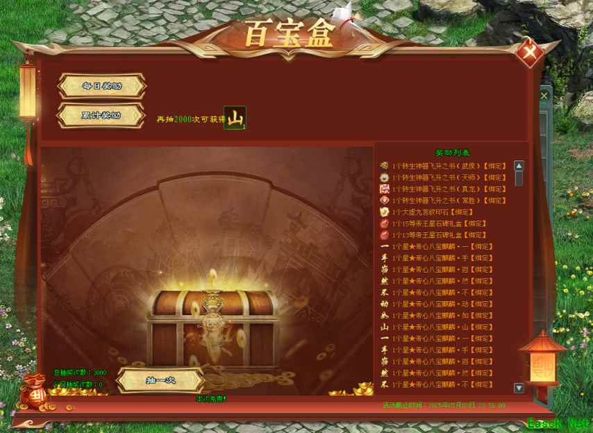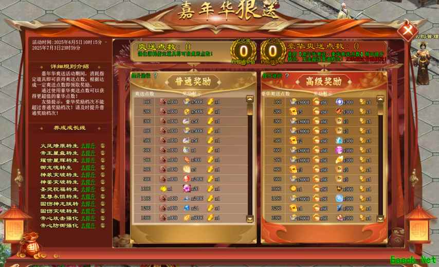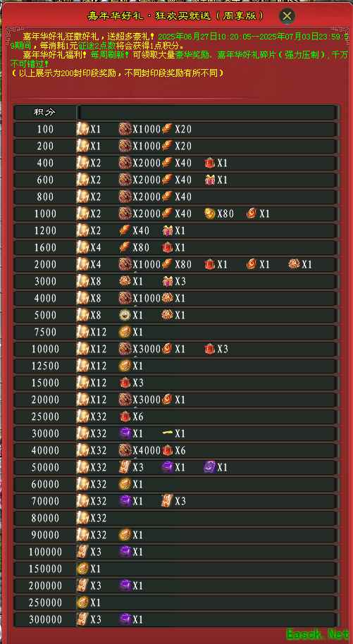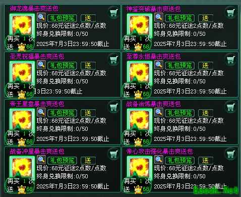 根据封印等级不同,奖励略有不同,以游戏内为准;3、嘉年华格斗之王·2025年度全区赛事,单区联赛开打!单区联赛时间:6月26日-7月8日(风雨同舟区服赛程、奖励与其他区服存在不同)比赛区服:150封印解封区(截至:春意十里)全区冠军将获得: ·专属冠军C界面、入场特效、头像框、排名称号,以千场不败之血,刻此王者之名于顶巅! ·坐骑·格斗之王·决斗龙神(90天),身披玄铁重铠,手握斩岳巨剑,龙魂缠身,战意凌霄!此座之上,只载天下第一!>>>>点击查看详细赛程、战区划分<<< 单区赛奖励: 根据封印等级不同,奖励略有不同,以游戏内为准!4、家族团圆包活动时间:6月27日活动区服:110封印解封区活动期间,每天20:00-22:00在线家族成员达到一定数量,则家族在此期间上线过的所有成员都可领取家族团圆礼包。在线人数越多,领取的家族团圆礼包越高级。高级家族团圆包奖励包括:30锭银卡、新·坐骑碎片自选、新·星魄铭印!温馨提示:根据封印等级不同,奖励略有不同,以游戏内为准!二、玩家建议反馈优化&问题修复【玩家反馈建议优化】1、由于家族乱武“占旗”机制得分占比较大,为了平衡乱武中所有事件的得分比例,对家族跨区乱武追分效率进行优化:(1)提升攻占大鼎得分,攻占大鼎成功时,每位家族成员可获得的分数提升4倍;(2)提升攻占小鼎得分,占领小鼎时第1/2/3名家族的涨分效果,分别修改为1/4/8分;(3)提升击杀对手得分,击杀第1/2/3名敌方家族玩家,分别可获得13/5/2分;(4)提升击毁敌方战车得分,击毁第1/2/3名敌方家族战车,分别可获得38/15/6分;(5)易伤buff最高叠加效果由25%提升至30%,触发易伤buff的击杀人数上限由20人降低至16人;2、跨区BOSS奖励优化:跨区BOSS掉落奖励新增无双帝王神石、中级凤鸣图纸,根据BOSS颜色,掉落数量有所不同;3、庄园奖励优化:200级区庄园内新增稀有种植“龙吟星宝石树”,每天可种1颗,根据宝石树品质将收获不同数量的龙吟星升级宝石,种植在王城有概率获得双倍收获次数;4、龙宫镖车调整:(1)当龙宫镖车的龙宫转盘发生抢夺时,抢夺者和被抢者家族都将收到抢夺成功/被抢夺的消息提示;(2)砸车时有概率抢夺对方的龙宫转盘与经验转盘,每日抢夺次数存在上限;5、组合鉴定操作优化:点击组合鉴定界面“录入”按钮时,可自动识别并使用包裹中通天录自选、通天录自选碎片道具(仍将优先使用对应的完整通天录道具);6、无双帝王神石购买界面优化:默认购买数量修改为最低价格的道具总数量;7、170解封区(截至:万象春天)开启霸区国战爽战计划;8、优化玩家体验,副武器强化界面新增“全部记忆转化”按钮,点击可一键兑换包裹中所有类型、对应品质的副武器记忆;9、优化玩家体验,强化界面右侧新增滑块,便于快速拖动到指定强化页签;10、优化玩家体验,天空砖刷新为绿砖时,依然为弹窗提示防止误操作;11、优化玩家体验,修改了金山限定·战技书系列道具道具名,便于区分激活道具,并开放技能书快捷兑换为主公历练令;12、修复了部分情况下银卡足够时,御龙魂强化手续费仍显示为红色的问题;13、修复了一处排行榜显示问题;14、修复了“浩瀚星空”路径在鉴赏界面显示异常的问题;15、修复了曹操变身状态下,无法自动释放内挂系统内设置的技能、无法自动召唤宝宝的问题;16、修复了家族聚宝盆领奖时部分奖励显示不全的问题;17、修复了部分情况下无法打开“风火轮”副武器强化界面的问题;18、删除了BOSS宝箱内的避雷符、聚雷鼎道具;【功能与优化测试】1、镖车伤害优化测试测试时间:6月24日已开启测试区服:夏日荣耀、十万逐鹿、大国战对决专区提高了砸镖车造成的伤害;2、镖车传送功能测试测试时间:6月26日更新后测试区服:大国战对决专区、十万逐鹿超值月卡新增“镖车传送”权益:组队镖车可以便捷传送至龙牙关,队伍内任意一人拥有月卡权益,即可全队传送!3、战魂便捷强化测试测试时间:6月26日更新后测试区服:风雨同舟、人气第一区、大国战对决专区、为爱而战进行战魂强化时,可用低等级的银、硬皮、材料兑换券,快捷兑换与合成为高等级的银、硬皮进行强化;4、“仇敌”系统优化测试测试时间:6月24日已开启测试区服:风雨同舟、人气第一区、大国战对决专区记录深仇玩家数量上限调整为50人;三、通过名人堂限时买就送获得“嘉年华·名人堂投票券”,为你心中的传奇英雄投上关键一票!帝心通天榜开启,有机会获得15星帝王星转生直升石,直接提升帝王星转生星级!嘉年华暴击爽送礼包,打开即有机会触发暴击!1、名人堂·限时买就送,票选十二风云战神!活动时间:6月20日-7月3日活动区服:全区嘉年华·名人堂,全区票选十二风云战神,谁是真战神由你决定!通过名人堂限时买就送可获得“嘉年华·名人堂投票券”,为你心中的传奇英雄投上关键一票!购买指定个数,还可获赠凤鸣星罗、十二风云战神神将卡(最高可获4-5星)。 根据封印等级不同,奖励略有不同,以游戏内为准!“嘉年华·名人堂投票券”全区收售同步开启 2、嘉年华狠送活动时间:6月7日-7月3日活动区服:200级区(截至:年终狂欢)消耗指定强化道具,获得“爽送点数”;购买指定道具,获得“豪华爽送点数”。积累点数以获得对应档次奖励,包含:豪华圆满核心、爽送兑换卡、嘉年华暴击爽送包自选、轮回灵石等丰厚道具!温馨提示:可将鼠标放置于嘉年华狠送界面中“提升途径”,查看如何获取狠