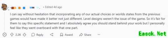 Audette还透露,《龙腾世纪:影障守护者》是其25年职业生涯中媒体评价最高的作品,并强调对团队成果感到自豪。该言论随后被Reddit用户转发至龙腾世纪主题板块,引发玩家热议。 有玩家表示:“可以毫不夸张地说,如果能够延续前作的真实选择与世界状态传承,本作完全有机会成为更优秀的续作——而不仅仅是另一个版本。关卡设计绝非游戏的核心问题。开发团队当然有权利坚持自己的创作理念,我也完全认同开发者应当为自己的作品发声,但就"不可能做得更好"这一表述而言,个人认为确实有些言过其实了。”对于这番表态不少玩家纷纷表示赞同。