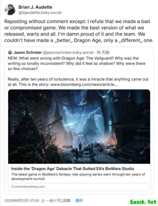 Audette在社交平台Bluesky发文表示,他反对外界关于该作是"糟糕或妥协产物"的论断。"我们呈现的是现有条件下最完善的版本,虽有瑕疵但无愧于心,"他写道,"我们不可能做出更好的《龙腾世纪》了,只能是另一个不同的版本。"