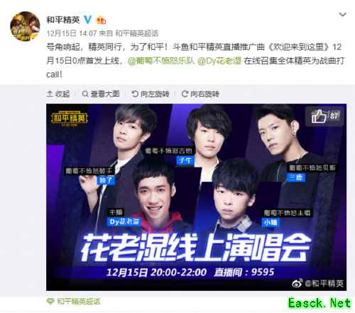 和平精英直播推广曲,好评如潮 除了主播和解说,花老湿还有一个身份——歌手。 12月15日,花老湿在网易云首发了全新的和平精英直播推广曲——《欢迎来到这里》,这首歌是和国内知名乐队葡萄不愤怒合作完成的。葡萄不愤怒是国内新锐朋克乐队,不仅受邀参与了热门综艺《乐队的夏天》,更在娱乐圈收获了不少像乔欣这样的明星粉丝。此次合作录歌是一次大胆的尝试,同时也让粉丝们眼前一亮,没想到平时游戏技术极佳的花老湿在歌唱方面也是如此有天赋。网易云里不到1天更是收到了上千条评论,足见其受欢迎程度!