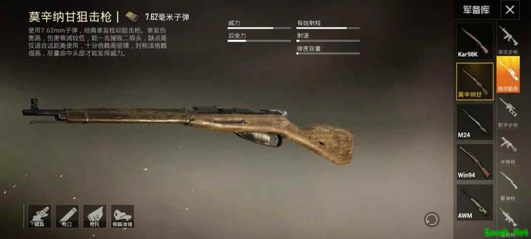 新枪械莫辛纳甘:使用7.62mm弹药的栓动狙击枪,威力与Kar98K相同,但子弹飞行速度更快,伤害衰减更小,可在较远距离单发淘汰无甲目标。