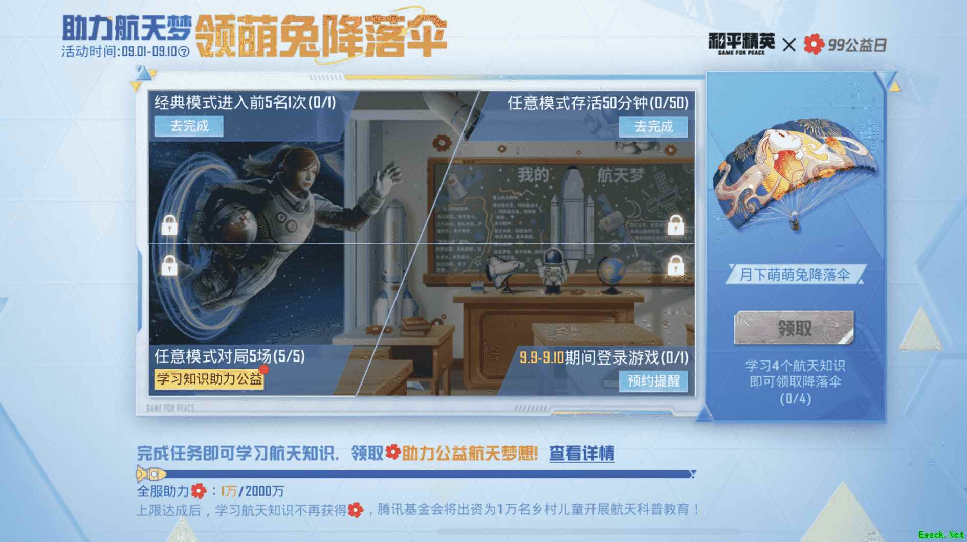 自“4peace和平精英长线公益计划”正式发布以来,“公益”一直是《和平精英》品牌的重要组成部分。《和平精英》携手各界,用更多的实际行动与玩家共同为和平贡献自己的爱心和力量,向社会传递正能量。此次“筑梦航天,一块做好事”公益活动,广大《和平精英》玩家也能通过在游戏内通过学知识收集“小红花”,并捐出小红花共同为乡村儿童助力航天梦尽一份力。 用小红花,一块做好事!《和平精英》×99公益日助力乡村儿童航天梦 作为全球最大的公益节日之一,2022年99公益日将于9月1日正式启动,今年首次推出“一花一梦想”的新功能,实现公益项目的“逆向发起”和“全民共创”,让每个网友都可以为自己关注的公益领域直接贡献力量。 9月1日至9月10日活动期间,《和平精英》在游戏内推出“助力航天梦”主题活动,让更多人参与到“筑梦航天,一块做好事”公益活动之中。玩家们不仅能在活动中学习专业的航天知识,获取“月下萌萌兔降落伞”限定道具;还能获取小红花并捐出助力乡村孩子航天梦! 公益活动期间,广大玩家每累计捐赠2000朵小红花,就能助力1名乡村儿童获得航天科普教育;最多可以助力10000名乡村儿童的航天梦想。待活动筹集小红花达到400万朵,广大玩家就能共同助力“航天梦”,届时,腾讯公益慈善基金会将按进度进行捐赠。《和平精英》99公益日邀请各位玩家共同为乡村儿童的航天梦助力!