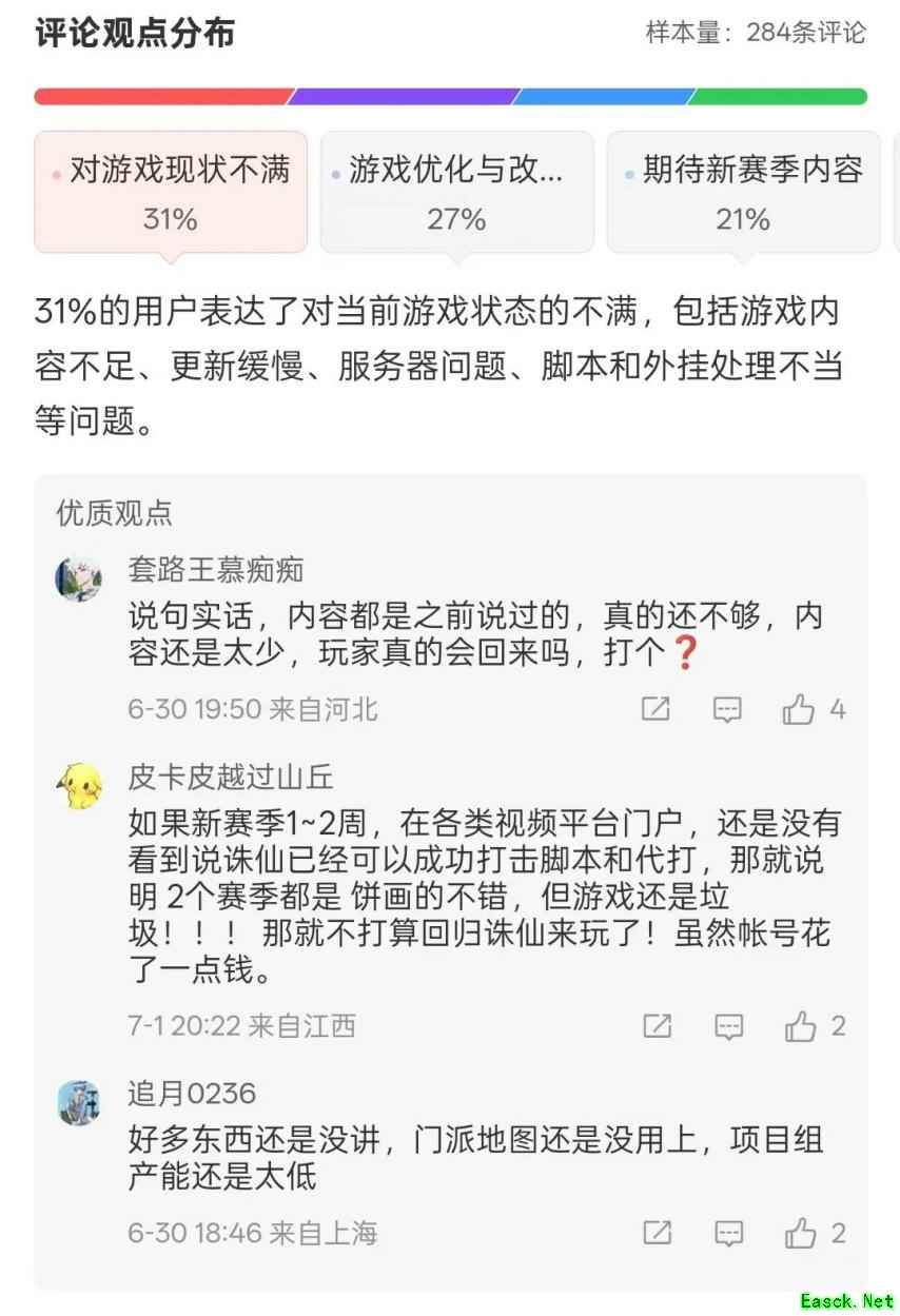 “诛仙世界”这款游戏能获得半数以上玩家的期待,说明它在玩家中有着较高的口碑。对于新版本S2赛季,玩家们充满了期待和关注。 对于新版本的影响,可以从以下几个方面来分析: 1. **游戏内容**:新的赛季和版本通常会带来新的游戏内容,比如新的地图、新的任务、新的装备等,这些都会吸引玩家。同时,新的赛季和版本也常常会带来一些改变,比如改变了游戏的规则或者调整了游戏的难度,这些都会使游戏更加有趣。 2. **玩家体验**:新的赛季和版本可能会对玩家的游戏体验产生影响。如果新的内容或者改变能够更好地满足玩家的需求,那么玩家的游戏体验将会得到提升。反之,如果不能满足玩家的期望,可能会影响玩家的游戏热情。 3. **社区氛围**:新的赛季和版本也可能引发一些讨论和争议,这可能会对社区的氛围产生影响。一些积极的讨论可以促进社区的活跃度,但过度的争议也可能引发一些负面的情绪。 总的来说,玩家们对新版本的期待是积极的,但如果新的版本不能很好地满足玩家的期望,可能会影响到游戏的社区氛围。因此,游戏开发者在推出新版本时,需要充分考虑玩家的需求,以确保新版本能够提升玩家的游戏体验。 以上内容仅供参考,建议咨询游戏行业专业人士获取更准确的信息。 《诛仙世界》S2赛季还有6天即将开启(从发稿时间算起)。 项目组近期动作不断,大量联动内容、实机画面曝光,超多福利即将到来,但仙友们对S2赛季买不买账,官方又带来了哪些惊喜呢,接下来就让我们一起看看吧! S2赛季官方定义及玩家反应 1项目组对S2赛季的定义游戏制作组在6月30日发布了「孤心撼海」版本的资料片,其中官方将S2版本定义为对仙友们的还债季。 官方自觉S1赛季亏欠仙友们太多,且官方承诺新版本拒绝空谈,只干实事!(至于做不做的到,仙友们都将看在眼里) 官方微博原文 S1赛季项目组做的那些“事情”,如一一列举,篇幅占据过长,这里不再详细展开说明,只想说,现在都还有仙友对制作组非常的不满! 游戏的内容固然为重中之重,但对待事情的态度也非常的重要。 2玩家反应「孤心撼海」版本资料片发布以后,也同样有很多玩家对S2赛季的信心不足,大致有以下几点。 其一,有仙友仍觉着内容过少,产能依旧会是个大问题;其二,对S2赛季官方打击脚本、工作室和代练的能力仍保持怀疑态度;其三,对S2赛季开新服和部分区服没有合并计划表示不理解。 有21%的用户对新赛季内容表示了明确的期待。 因官方账号发布的内容,往往伴随转发抽奖活动,所以关于抽奖评论的占比达到了21%,在去除21%对新赛季表示明确期待的仙友,剩余58%仙友或表示了质疑,或希望有更多的功能、玩法等上线。 但整体来看,对新赛季保持了期待的仙友还是达到了60%以上。 这个比例或没太大问题,赛季末长草期过长,玩法匮乏,本身就没有什么比新的内容更让人期待! 总体来看,愿意再给项目组一次机会的仙友并不在少数,也希望项目组能再抓住这次机会,不负玩家热爱! 补充 1下赛季内容占比官方在前瞻资料片中给出赛季玩法分布占比情况,其中S1赛季玩法分布[PVE:PVP:PVX]达到了惊人的[9:1:1],副本世界实锤! 第二赛季各玩法占比调整为了[5:3:3](PVE:PVP:PVX)。至于是策划随口一说,还是确实如此,仙友们可在下周三更新以后实际体验。 个人认为,S1赛季的问题更多出在了官方处理问题不及时上,响应缓慢,导致了玩家的不信任感,S2赛季官方如能摆正态度,《诛仙世界》或仍将大有可为!让我们一起见证吧! 仙友们还愿意再给游戏制作组一次机会吗?也欢迎在评论区留言讨论!以上为本期的全部内容,感谢您的观看! 《诛仙世界》动态、攻略、活动、玩法 |
