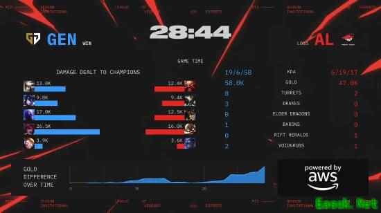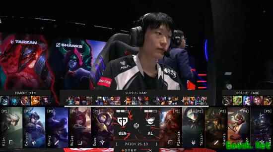 原微博链接>>> 本场比赛选用英雄如下: AL:Flandre 古拉加斯、Tarzan 斯卡纳、Shanks 卡西奥佩娅、Hope 库奇、Kael 慎 GEN:Kiin 卡蜜尔、Canyon 瑟庄妮、Chovy 瑞兹、Ruler 霞、Duro 布里茨 本场比赛战报速览: 5分钟,GEN Canyon瑟庄妮支援中路,击败卡西奥佩娅拿下一血; 14分钟,野区爆发团战,AL完美拉扯,AL Shanks卡西奥佩娅拿下三杀,AL完成一换四; 22分钟,双方争夺小龙,GEN Duro布里茨机械飞爪多次命中,GEN团灭AL; 27分钟,双方再次争夺小龙,GEN Duro布里茨再次开团,GEN Chovy瑞兹拿下三杀,GEN团灭AL并推平基地赢下比赛。