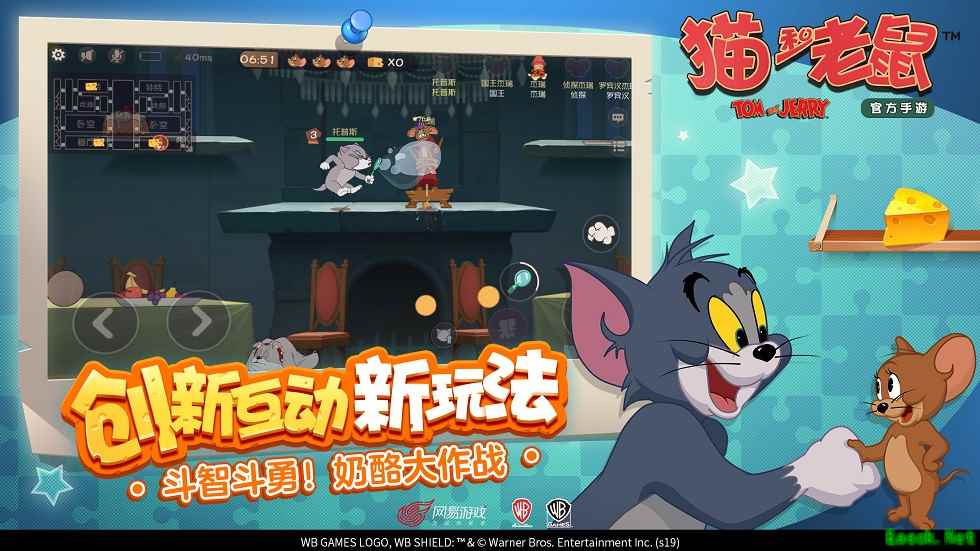 游戏的欢乐气氛和对抗的竞技策略性相辅相成。聪明机智的玩家总能奇招频出,利用各种道具互相整蛊,或在多变的地形中上演追逐好戏,保证让游戏中你的捧腹大笑! 熟悉老友登场,经典角色任你选 游戏提供了丰富的角色阵容供玩家选择,猫阵营的汤姆、布奇、托普斯,鼠阵营的杰瑞、国王杰瑞、剑客杰瑞等,它们个性鲜明外表抢眼,灵感及原型均来源于动画。根据每一位角色的性格和背景,它们都有自己的专属技能,在游戏中有着不同的定位及作用。