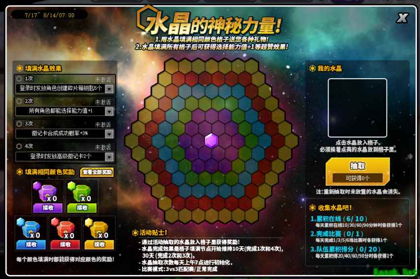 活动时间:7月17日7点~8月14日7点 活动规则: 通过活动获得的水晶放入格子里获得奖励。填满水晶获得的效果是格子填满节点开始维持十天(一次和四次奖励)和三十天(二次和三次奖励)。水晶抽取次数每日上午7点初始化。场次相关任务需进行正常结算的3V3匹配赛俱乐部联赛。 【哐当哐当!自由火车】