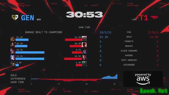 官方介绍:“开局3分钟,Oner盲僧抓到入侵野区的豹女,操作拿下一血。8分钟,双方同时选择越塔抓上单,Doran安蓓萨精彩操作完成反杀,Kiin鳄鱼尽力完成一换一,T1拿到战斗先机点。23分钟,Kiin鳄鱼关键控制定住狼母,Ruler金克丝拿下终结开启罪恶快感,GEN完成零换二团战并拿到小龙。25分钟,Ruler金克丝夹子定到盲僧,GEN拿到厄塔汗并完成零换二,顺势控下大龙,T1迅速推掉中路高地进行止损。30分钟,Duro塔姆及时大招保护住金克丝,GEN集火将安蓓萨击杀后选择抱团进攻,Ruler金克丝极限生存,完美打出高额输出,GEN一鼓作气完成团灭并拆掉水晶,获得本场比赛的胜利!”