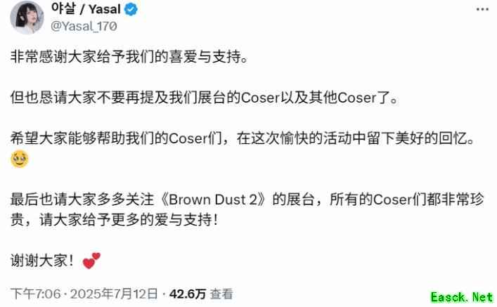 7月12日,Yasal发X回应了这一事件,说道:“非常感谢大家给予我们的喜爱与支持,但也恳请大家不要再提及我们展台的Coser以及其他Coser了,希望大家能够帮助我们的Coser们,在这次愉快的活动中留下美好的回忆。最后也请大家多多关注《棕色尘埃2》的展台,所有的Coser们都非常珍贵,请大家给予更多的爱与支持!谢谢大家!”