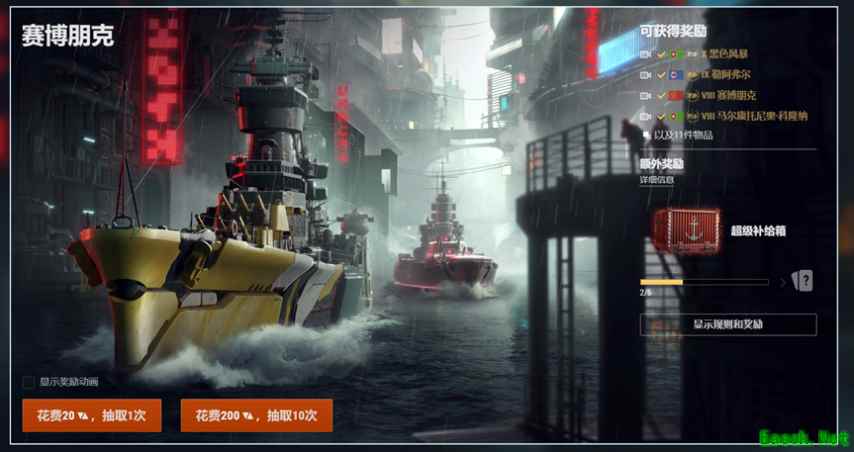 开始抽奖! 在本次赛博朋克随机礼包中,您有1.35%的概率抽取到战舰,而如果您未能获得战舰,则会获得标准奖励组中的奖励,其中必定包含5枚跃迁代币。您在获得任务中所有的60枚代币后,如果您再花费500金币购买20枚代币,那么就可以完成4次抽奖,如果您在这四次抽奖后并未能获取战舰,那么返还的20枚代币够您进行第五次抽奖!