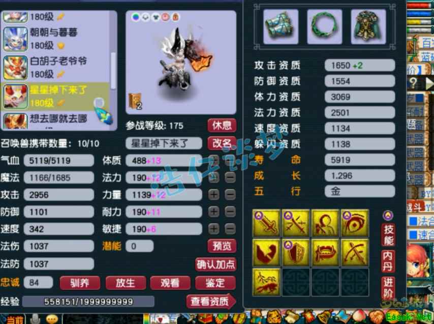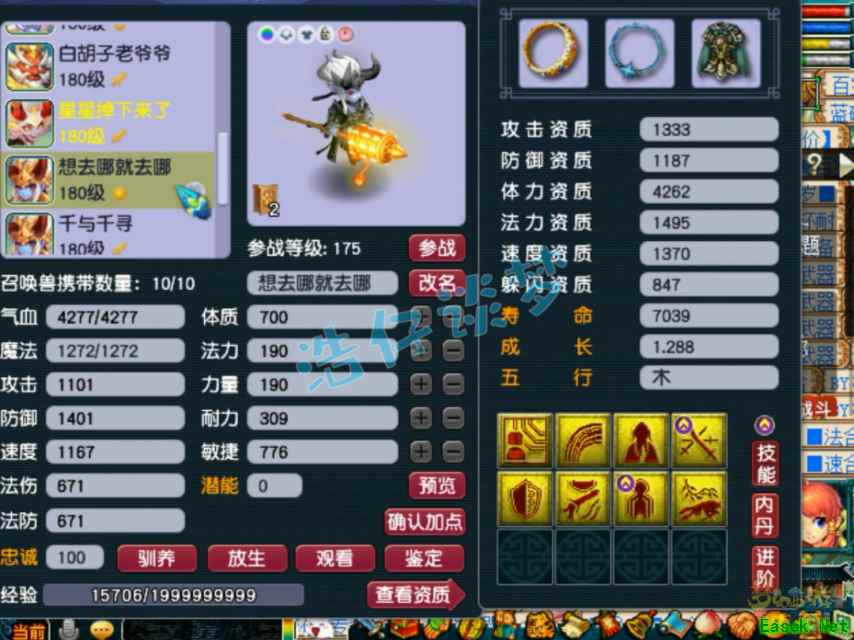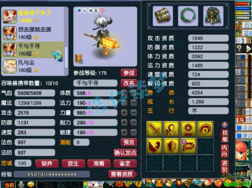 7技能高连全力自在心猿,普通任务用的效率攻宠,套装带的是善恶有报。 好了,这个175级化生寺展示完毕,比较标准的14+9硬件加身,凑齐了愤怒5特技,PK中操作还是非常灵活的,可以跟15甚至16锻的输出门派做队友。 |