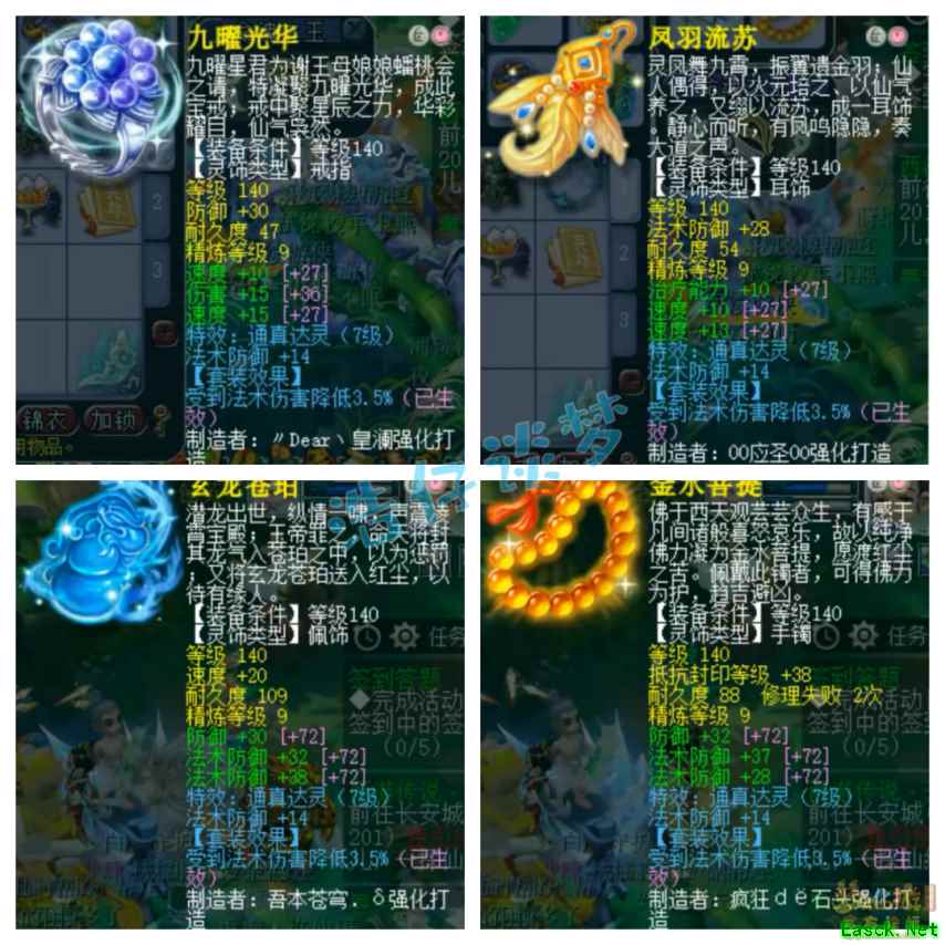 戒指下排双速度一伤害,耳饰下排双速度一治疗,配饰手镯下排都是双法防一防御,全部打了9锻星辉石,特效都是7级通真达灵。
