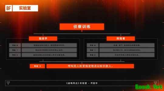 这些功能旨在激励玩家使用特定武器,但所有装备和武器都可以用于任何兵种,因此该系统能否实现其目标还有待观察。 战地实验室目前仍处于测试阶段,因此所有功能都可能发生变化,但不要指望兵种系统会在短期内发生重大变革。 《战地风云》实验室 – 社区更新 – 兵种系统 – 第二部分 本次社区更新将介绍《战地风云》实验室中兵种系统的当前状态,并分享来自早期体验玩家的一些洞察。 虽然目前《战地风云》实验室中还有一些系统尚未开放,但本文讨论的内容对于明确各兵种定位,对于我们打造《战地风云》系列有史以来最强兵种系统的目标至关重要。 我们也看到了社区中有关回归旧系统与限制武器选择的建议。在我们的讨论中,这些声音至始至终都有被认真考虑。我们的目标是让无论是新上战场的玩家或是老兵都能更好地融入《战地风云》的战场体验,强化团队协作,并为长远的未来建立一种大家都能理解的统一系统框架。 我们收集了大量关于兵种的玩家反馈和数据,用于改进下一代《战地风云》。部分优化可以通过《战地风云》实验室中的测试快速完成,像是在服务器端指令就可以实现的平衡机制调整;而另一些则需要开发新工具或进行客户端更新,因此需要更长时间。 兵种系统回顾 正如我们在第一部分中提到的,我们当前对兵种系统的核心目标,是让玩家能够清晰识别并直观感受到每个兵种在战场上为小队带来的独特价值。 我们希望通过各兵种之间相互关联的机制与核心设定,来塑造他们在战斗中的定位,同时保留足够的自由度,让玩家能够根据自身风格,灵活决定如何执行这个角色。 兵种系统 兵种系统由两个主要组成部分构成:可自定义要素与兵种塑造要素。 可自定义要素给予玩家自由,让他们可以在不违背兵种职责的前提下,探索并拓展各自兵种在战场上的兵种能力边界。而兵种塑造要素则专为强化“拿起就能打”的上手体验而设计,进一步巩固玩家对兵种定位的认知与期望。 在本次社区更新中,我们将以侦察兵为基础案例,详细说明其标志性要素。 选择你的“训练路线” 可自定义要素:训练 训练旨在强化每个兵种的独特优势,确保你在战场上的角色既有影响力又具战略意义。在自定义你的装备时,每个兵种都会有两条独特的训练路线可供选择。这些训练路线会带来属性数值上的加成和好处,帮助你在各种模式下更好地完成团队协作与任务目标。 训练路线共分为三个等级: · 等级0:被动效果,在你选择训练路线后立即生效。 · 等级1与等级2:强化版效果,进一步提升你所选角色的表现。只能通过团队协作表现与经验分数(XP)获得。 · 等级3:一次性使用的主动技能,由玩家手动触发,可根据战局为你自己、你的队伍,或当前战斗情况带来关键优势。 以侦察兵为例,等级3技能是:呼叫一架可被摧毁的无人侦察机到指定地点以标示敌人。在技能激活后,你需要持续与队友协作,积累足够的进度才能再次使用该技能。 在你参与团队合作或推进特定模式之目标的过程中,你将沿着所选训练路线,逐步解锁并获得每一阶段的加成。每当你使用一次等级3技能时,该路线会重置回等级2,必须重新积累进度以再次获得等级3技能。此外,每回合开始时,训练路线的进度也将被重置。 通过《战地风云》实验室,我们正在验证每条训练路线的升级节奏、实际影响与平衡性,从而调整它们在各自兵种中执行任务时的效果与强度。 侦察兵擅长远程射击与隐秘作战,你的训练路线正是为了强化并引导这种作战风格。如果你在战斗中偏好贴身作战,也可以选择“探路者”这条训练路线,它具备诸如在非冲刺状态下不会被敌方装备察觉等强化效果,适合更灵活、近距离的作战方式。 虽然训练系统目前仅在《战地风云》实验室中进行了两轮测试,但我们已经发现了多个待优化的方向,并计划在正式上线前进行改进。这个系统的核心目标是提升兵种执行效率,并强化团队协作动机,而《战地风云》实验室为我们提供了足够的空间与时间,确保这些目标得以实现。 所有设计,都与兵种定位有关 兵种塑造要素:标志性武器 每个兵种都有一把与其兵种定位紧密关联的标志性武器,这项设定的初衷正如本系列第一部分所述——强化每个兵种的核心职责与作战风格。 虽然所有武器在正确的战斗环境中都能发挥作用,成为你装备配置中有价值的物品之一,但选择使用与当前兵种相匹配的专精武器类型,将会获得专属的被动加成,进一步提升你在该兵种下的战场表现。 · 突击兵 & 突击步枪 突击兵是前线步兵中的中坚力量,负责带头冲锋并快速应对突发战况。使用突击步枪时,你将在冲刺后开火的过渡速度上获得加成,从突击步枪切换至其他武器也会更加迅速,提升机动性与反应速度。 · 工程兵 & 冲锋枪 工程兵的任务是不计一切代价进行破坏与修复,不惜深入敌阵、贴身作战。在使用冲锋枪时,你将获得更好的腰射控制力。 · 支援兵 & 轻机枪 支援兵常处于火力密集的战斗核心区,擅长运用重型装备。在使用轻机枪压制敌人时,支援兵将不会像其他兵种在使用相同武器时所产生的冲刺速度惩罚,使其更能灵活穿梭战场。 · 侦察兵 & 狙击步枪 使用狙击步枪时,准星晃动将减少,并能通过屏息更稳定地瞄准。对狙击步枪的高熟练度也会让侦察兵在每次射击后更快完成重新装填动作。 