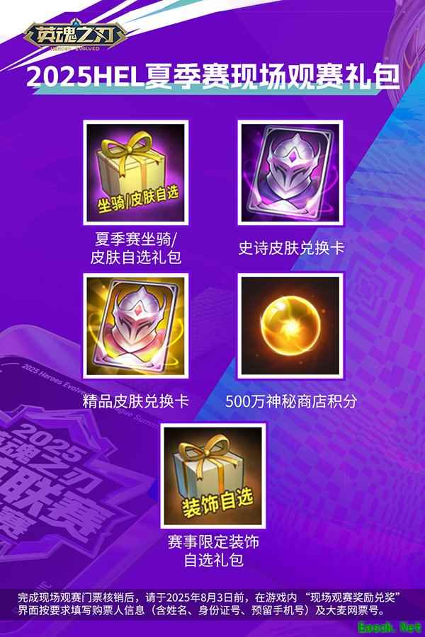 观赛礼包:史诗级福利,游戏资产一键到账 完成门票核销的玩家,可于 8月3日前 在游戏内“现场观赛奖励”界面提交购票信息(姓名、身份证号、手机号及大麦网票号),领取五重专属福利: 1.500万神秘商店积分。 2.精品皮肤兑换卡。 3.史诗皮肤兑换卡。 4.夏季赛坐骑/皮肤自选礼包。 5.赛事限定饰品自选礼包。