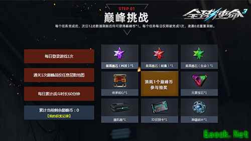 巅峰挑战,每日任务赢好礼 即日起至7月28日,玩家每日登录活动页面可接取三项活动任务。任务一:每日登录游戏1次,即可领取巅峰币1,轻松开启奖励之旅;任务二:通关任意层数的“巅峰战役”地图,无论单刷还是组队,只要成功突围即可完成任务,次日12点数据刷新后获得巅峰币1;任务三:每日累计战斗时长满60分钟,沉浸式体验次元战场,时间累计即可完成任务,次日领取巅峰币1。累计的巅峰币可参与抽奖,每消耗1个巅峰币抽一次。奖池包含星屑品石(科技)、传承核心、搞机箱等8种实用道具,更有机会获得超稀有材料!