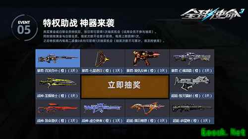 特权助战:神器来袭,抽奖赢好礼 购买黄金/白银会员的玩家,在当日还可获得 1 次抽奖机会(需注意,试用会员不参与抽奖)。奖池中的奖品令人心动不已,暴君-百发百中 (橙)(3 天)、暴君-七星逐日 (橙)(3 天)、暴君-复仇女神 (橙)(3 天) 等共 10 种限时神器体验,让你有机会在游戏中体验到顶级武器的强大威力,感受主宰战场的快感。