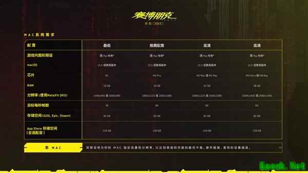 以下是游玩《赛博朋克2077:终极版》的Mac系统需求: 若通过GOG、Epic Games Store或Steam下载,需要92GB的存储空间;若通过App Store下载,需要159GB的存储空间。 最低配置为M1芯片和16GB内存,可以输出1440x900或1600x900分辨率的画面,目标帧率可达30 FPS。