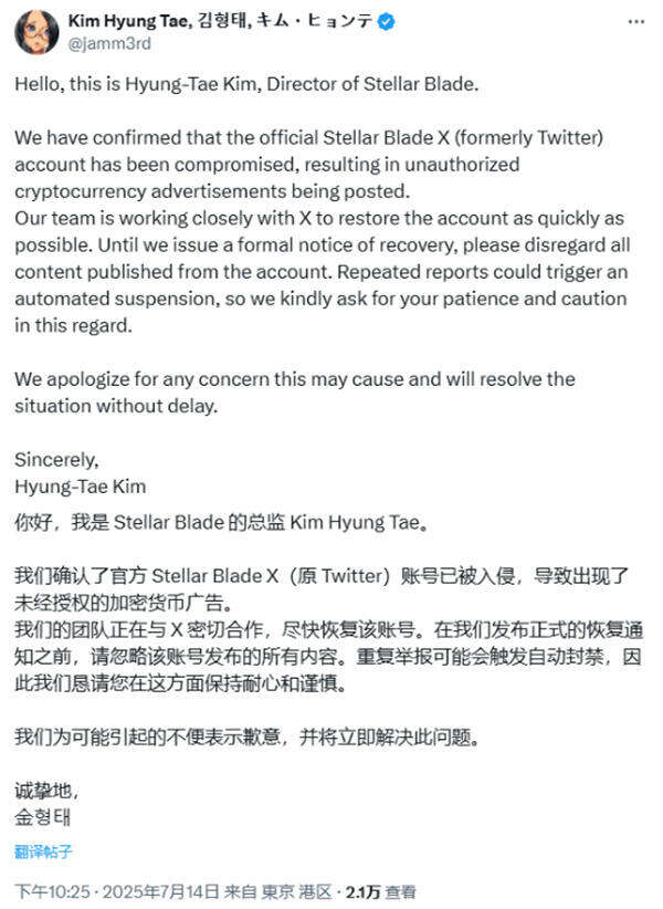 突发!《剑星》官方账号遭黑客攻陷,金亨泰紧急发声回应!