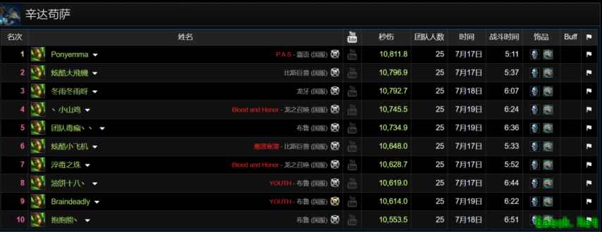 女王最强专精是火法,前十名存在7个(实际应该是8个,第一名惩戒骑的战斗日志有问题)。 冰龙是猎人主场,狂咒不会点名猎人,其他DEBUFF叠层也非常慢,别的职业打冰龙战战兢兢,猎人打冰龙就是火力全开。