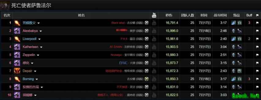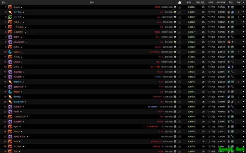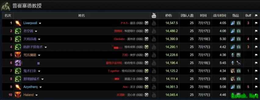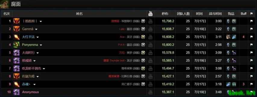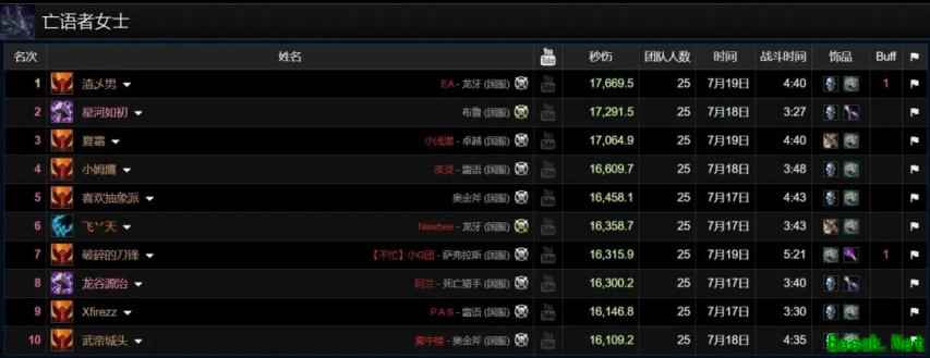 腐面前十名有4名惩戒骑、3名狂暴战,这场战斗对远程职业不太友好,需要频繁走位,近战的走位时间较少,并且还是小范围移动,不会影响DPS。