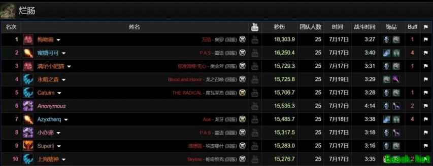 烂肠是猫德主场,前十名包含5名猫德、2名火法、2名惩戒骑、1名狂暴战。在这种可以全程打背的BOSS战斗中,真没人能打过猫德。这也是猫德的木桩数据是全职业最高的核心原因。