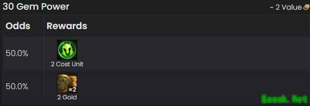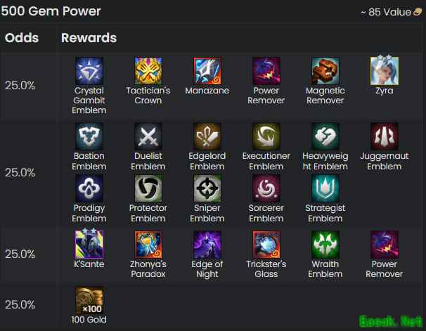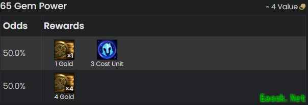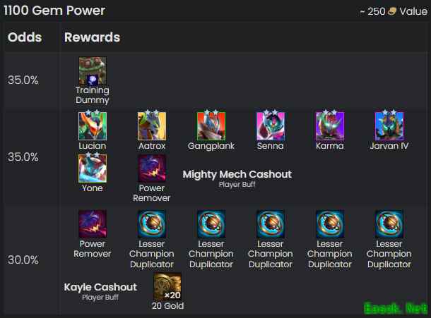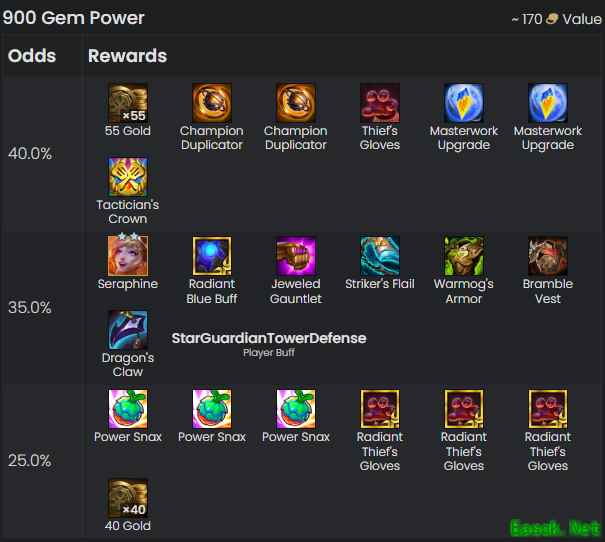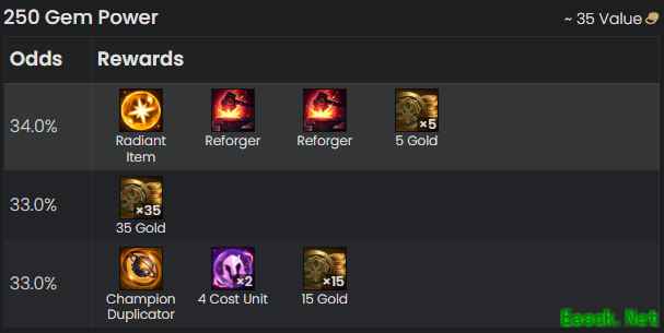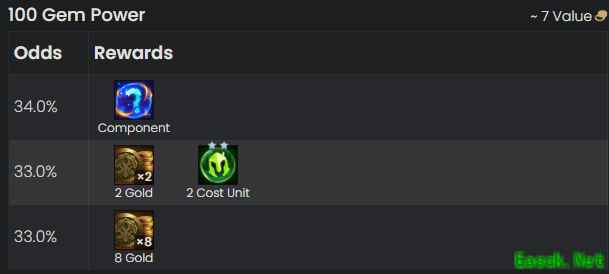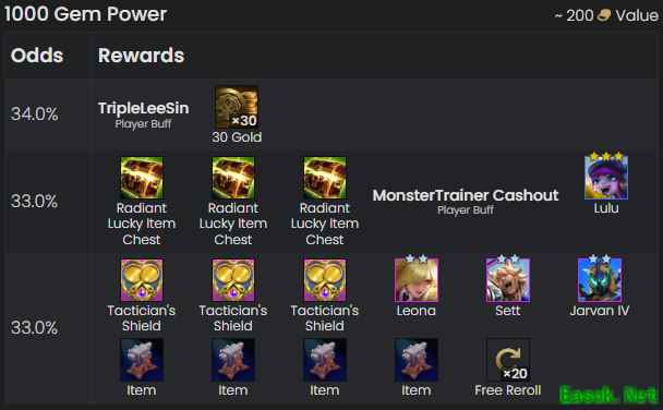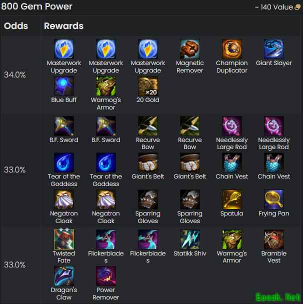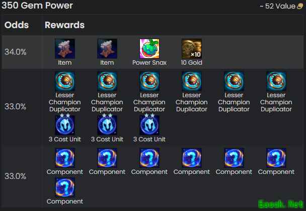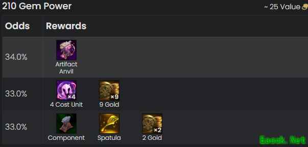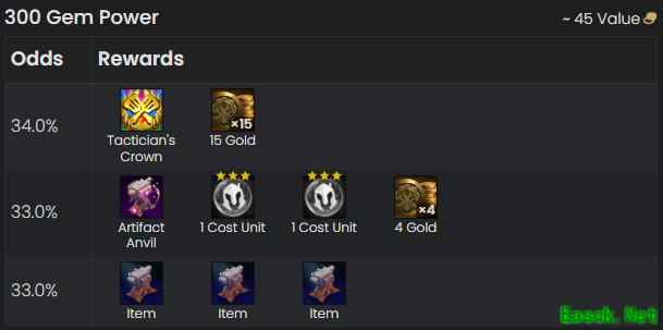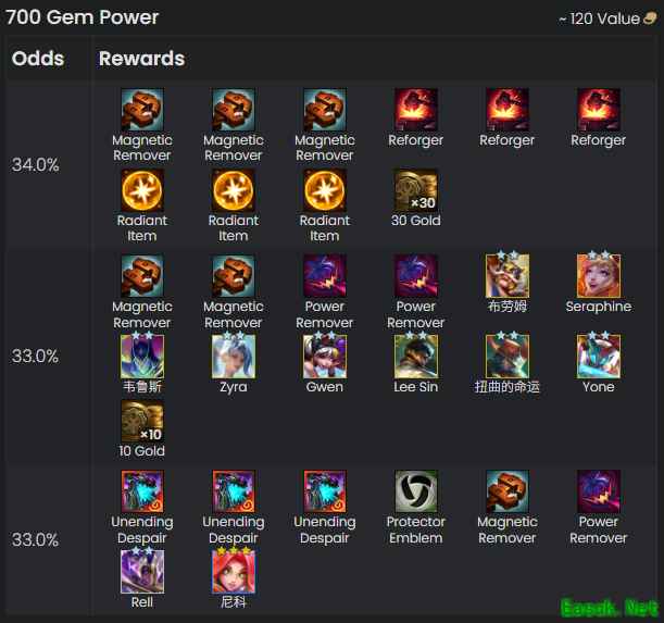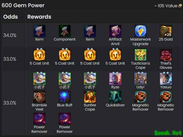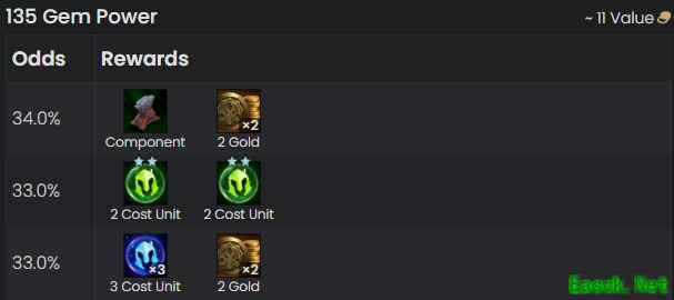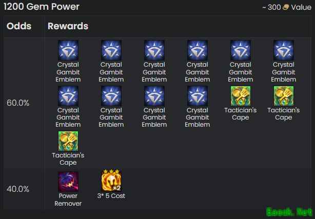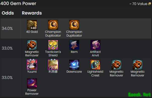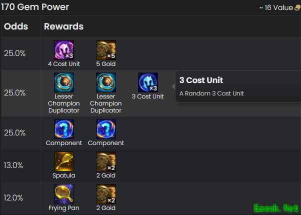 羁绊效果: 在玩家对战期间的击杀和失败会赚取【宝石能量】。每过4场玩家对战,可选择将【宝石能量】转化为奖励或者“加倍”在“加倍”处于激活状态时,失败会提供额外的100%【宝石能量】,但胜利会损失50%【宝石能量】并立刻提现。【宝石能量】的获取量会在第3阶段和第4阶段提升。 [3]每次击杀获得2,3阶段2,4及4+阶段3;每次失败获得22;3阶段27;4及4+阶段33 [5]每10次击杀,获得额外战利品并重随一个新的击杀数目。 [7]获得200%奖励。【水晶玫瑰】弈子们获得500生命值与45%伤害增幅 奖励列表 快速总结:金铲铲/金锅锅在170层,210层;大妮蔻在250层,400层,800层,900层;小妮蔻在170层。350层,1100层 0层:1金币 30层:50%1个两费棋子 50%2金币 65层:50%1金币+1个三费棋子 50%4金币 100层:34%1个蓝色法球 33%2金币+1个两星两费棋子 33%8金币 135层:34%1个散件锻造器+2金币 33%2个两星二费棋子 33%3个三费棋子+2金币 170层:25%3个四费棋子+5金币 25%3个三费棋子+2个小妮蔻 25%2个蓝色法球 13%1个金铲铲+2金币 12%1个金锅锅+2金币 210层:34%1个神器锻造器 33%4个四费棋子+9金币 33%1个散件锻造器+1个金铲铲+2金币评价:玩高水晶必控的两个层数,170层-250层之间,都有机会拿到铲和锅,铲子+腰带=水晶转 250层:34%1个光明武器+2个重铸器+5金币 33%35金币 33%1个大妮蔻+2个4费棋子+15金币评价:250层追三星四费非常合适 300层:34%1个金铲铲冕冠+15金币 33%1个神器锻造器+2个三星1费棋子+4金币 33%3个成装锻造器评价:300层我个人感觉一般般,还是250层香一点 350层:34%2个成装锻造器+1个强化果实+10金币 33%6个小妮蔻+3个两星3费棋子 33%7个蓝色法球评价:350层适合转3费主核阵容,例如阿狸,诺手,佛爷,蚂蚱等 400层:34%40金币+2个大妮蔻 33%1个拆卸器+1个金锅锅冕冠+1个成装锻造器+1个神器锻造器 33%1个两星猫咪+1个两星日女+1个神器【黎明核心】+1个神器【光盾徽章】+2个普通拆卸器+1个果实拆卸器 500层:25%1个水晶转+1个金铲铲冕冠+1个神器【魔蕴】+1个果实拆卸器+1个普通拆卸器+1个两星婕拉 25%各个职业转职纹章各1个,(堡垒,决斗,刀锋,裁决,斗士,主宰,天才,圣盾,狙神,法师,司令)共10个 25%1个两星奎桑提+1件神器【中娅悖论】+1个【夜之锋刃】+1个【诡术师之镜】+1个至高天转+1个果实拆卸器 25%100金币评价:500层的奖励我感觉10个不同的转就是陷阱,太容易因为过载而死了 600层:34%2个成装锻造器+1个散件锻造器+1个神器锻造器+1个杰作升级+25金币 33%4个两星五费棋子+1个金锅铲冕冠+1个【窃贼手套】 33%3个两星可酷伯+其余大宗师两星各1个+1个【反甲】【蓝buff】【日炎】【水银】+两种拆卸器各2个评价:基本上600层是大部分玩家的最终目标了,直接搏4个两星五费转95,再往上的层数就非常少见了 700层:34%3个普通拆卸器+3个重铸器+3件光明装备+30金币 33%两种拆卸器各2个+各个两星五费各1个(布隆,萨勒芬妮,韦鲁斯,婕拉,格温,李青,卡牌,永恩)+10金币 33%3个神器【无终恨意】+1个圣盾使转+两种拆卸器各1个+1个两星芮尔+1个三星妮蔻 800层:34%3个杰作升级+1个普通拆卸器+1个大妮蔻+1个【蓝buff】【巨人杀手】【狂徒】+20金币 33%各个散件各2个+1个金铲铲+1个金锅锅 33%1个两星卡牌+2件神器【迅刃】+1件神器【电刀】+1个【狂徒】【反甲】【龙牙】+1个果实拆卸器 900层:40%55金币+2个大妮蔻+1个【窃贼手套】+2个杰作升级+1个金铲铲冕冠 35%1个两星萨勒芬妮+1个【光明蓝buff】+1个【法爆】【破防】【狂徒】【反甲】【龙牙】+星之守护者buff(未知) 25%3个强化果实+3个【光明偷偷】+40金币 1000层:34%李青buff(不占人口的三个不同形态的三神装李青)+30金币 33%3个适配光明装备选择箱+1个三星露露+驯兽师buff(三位宠物全部上场) 33%3个金锅锅冕冠+1个两星日女+1个两星腕豪+1个两星皇子+4个成装锻造器+20次免费刷新 1100层:35%1个强化木桩(水晶增援:你的团队获得1000生命值,每有一个单位死亡时,一个低一星等级的水晶棋子就会加入战斗) 35%各个两星超级战队棋子各1个(卢锡安,剑魔,船长,赛娜,卡尔玛,皇子,永恩)+1个果实拆卸器+机甲合体buff 30%1个果实拆卸器+5个小妮蔻+20金币+天使buff(未知) 1200层:60%10个水晶转+3个金锅铲冕冠 40%1个三星五费棋子+1个果实拆卸器