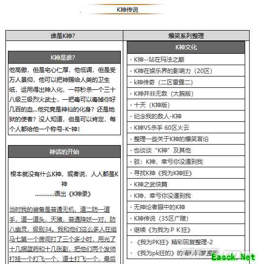 其中最出名的,当属那段被玩家奉为经典的文案:“他高傲,但是宅心仁厚;他低调,但是受万人景仰。他可以把神赐给人类的卫生纸,运用得出神入化,一符秒杀三十八级三级烈火武士,一把毒可以毒掉你好几百的血……他究竟是神仙的化身?还是地狱的使者?没人知道,但每个人都给他一个称号——K神!” 这段文字不仅定下了K神的名号,更催生了“K神卫生纸”的名梗。