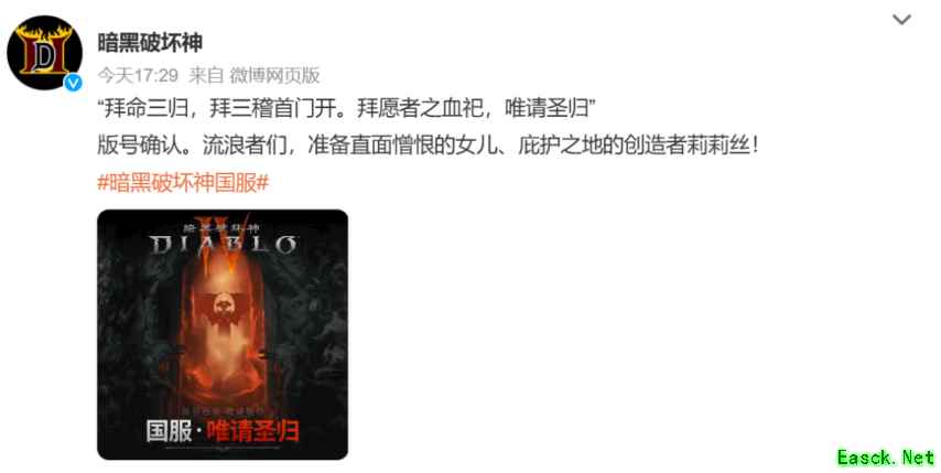 这意味着《暗黑破坏神4》将很快在中国大陆上线!同时,《暗黑破坏神》官方微博也发布了公告,宣布该游戏即将登陆国服,并邀请玩家们期待它的到来。公告中写道:“拜命三归,拜三稽首门开。拜愿者之血祀,唯请圣归。” 版号的确认使得玩家们终于能够在国内体验这款备受期待的作品,准备好面对憎恨之女、庇护之地的创造者莉莉丝吧!