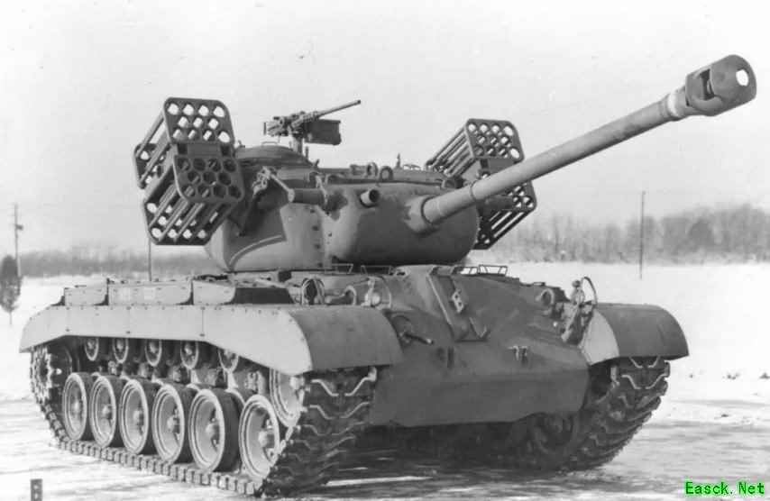 M26“潘兴”T99,两侧各加装22发火箭发射/定向架。