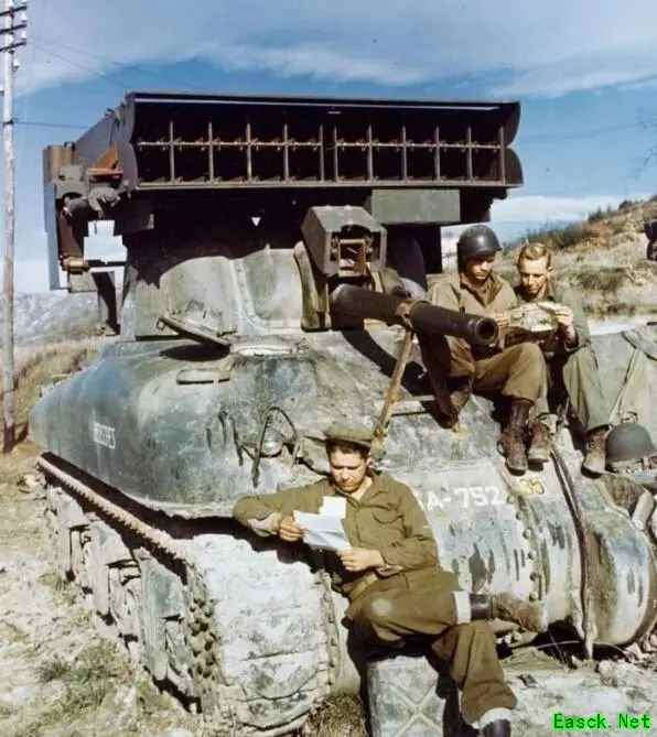 更原始一些的设计:M17火箭发射车,基于75毫米炮谢尔曼。 相比常规身管火炮,当时新兴的火箭原理射弹有诸多优势:炮尾不需封闭,后座力低;多管定向架布置下有更快的连射速度,有必要情况下可以一电门射空余弹;口径可以做得够大,威力管够。 但相应的,上述优点也有代价。定向架射速当然比炮管快,但准头全靠多发覆盖,一梭子下去能中一发就算赢;非封闭炮尾可以做到低甚至无后座力,但弹速要比常规炮弹慢至少一半;大口径火箭弹当然美,不过再想想一顿乱射之后,三四个乘员要把这单发几十公斤重的几十发火箭弹挨个塞进定向架……这画面不要太美好吧。 再说了,这些定向架和容纳的火箭弹,可都是一股脑地堆在坦克炮塔两侧,甚至是炮塔顶,就不说重心太高容易翻车这事,对炮塔机械结构和受击轮廓那是相当的不友好。
