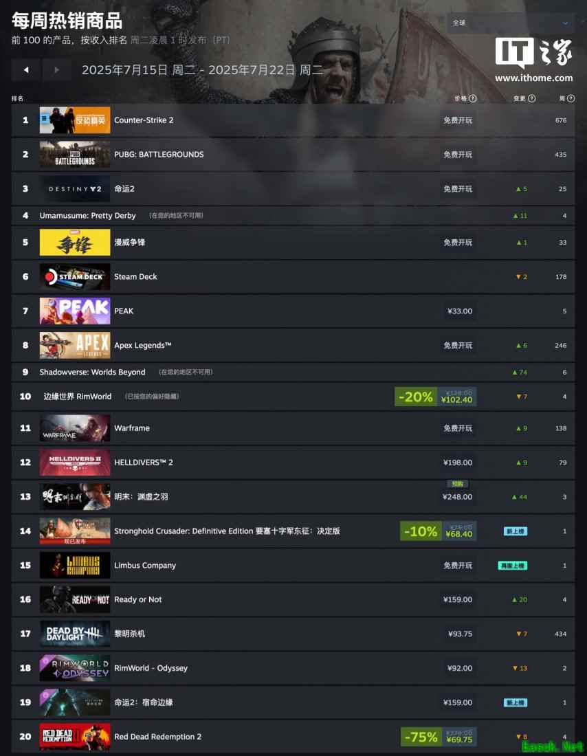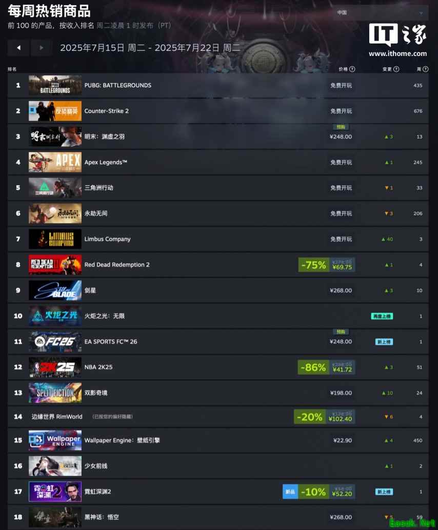 Steam新一周销量榜的公布,对于《PEAK》登顶全球榜以及国产动作游戏《明末:渊虚之羽》在国区取得第一的成绩,对于这两款游戏以及整个游戏行业都会产生一定的影响。 首先,对于《PEAK》来说,它的成功可能会激励开发团队继续保持高质量的游戏制作,并吸引更多的玩家关注和参与。同时,这也可能吸引更多的开发者投入到类似风格的游戏开发中,从而推动整个游戏行业的发展。然而,也可能会面临一些压力,比如对游戏内购买模式的质疑,以及游戏内容和社区管理的挑战。 另一方面,对于国产动作游戏《明末:渊虚之羽》来说,它在国区取得第一的成绩,无疑是对其制作团队的一种肯定。这可能会激励他们继续优化游戏,推出新的内容,并吸引更多的玩家。同时,这也可能带动国内游戏开发行业的进步,激励更多的人投身到游戏开发中。 对于玩家来说,这两款游戏的成功可能会带来更多的优秀游戏选择。同时,这两款国产游戏的成功也可能会提高国内游戏开发行业的知名度,吸引更多的玩家关注和参与。然而,也可能会面临一些挑战,比如游戏内购买模式可能会增加玩家的消费压力,以及如何处理游戏社区中的争议和冲突。 总的来说,Steam新一周销量榜的公布,对于《PEAK》和《明末:渊虚之羽》以及整个游戏行业都会产生一定的影响。这些影响可能是积极的,也可能是消极的,具体取决于游戏团队如何应对这些挑战,以及玩家如何看待这些变化。 Steam 平台现已公布最新一期游戏销量榜(2025 年 7 月 15 日-2025 年 7 月 22 日),在不计入 Steam Deck 游戏机的情况下,本周《PEAK》登顶全球榜单,国产动作游戏《明末:渊虚之羽》虽处于预购阶段,但目前排名已升至全球榜第四 / 国区第一。IT之家附全球榜单和国区榜单如下: 全球榜单《PEAK》 《边缘世界 RimWorld》 《绝地潜兵 2》 《明末:渊虚之羽》 《要塞十字军东征:决定版》 《Ready or Not》 《黎明杀机》 《RimWorld - Odyssey(边缘世界:奥德赛)》DLC 《命运 2:宿命边缘》DLC 《荒野大镖客:救赎 2》