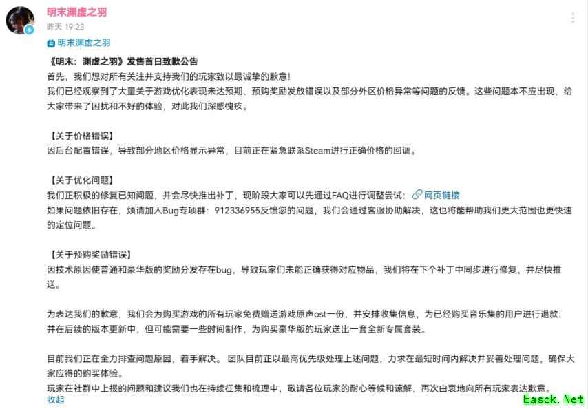 昨日发售的《明末渊虚之羽》,因发售时多个外区降价至低于国区数十元不等,遭到不少玩家的攻击。 对于此次事件,目前官方已发布公告将回调外区售价,恢复国区的最低价地位。 另外昨天发售时还发生了错配bug,普通版玩家也可以领到豪华版内容,关于这个问题,之后也将会为豪华版玩家发放补偿。